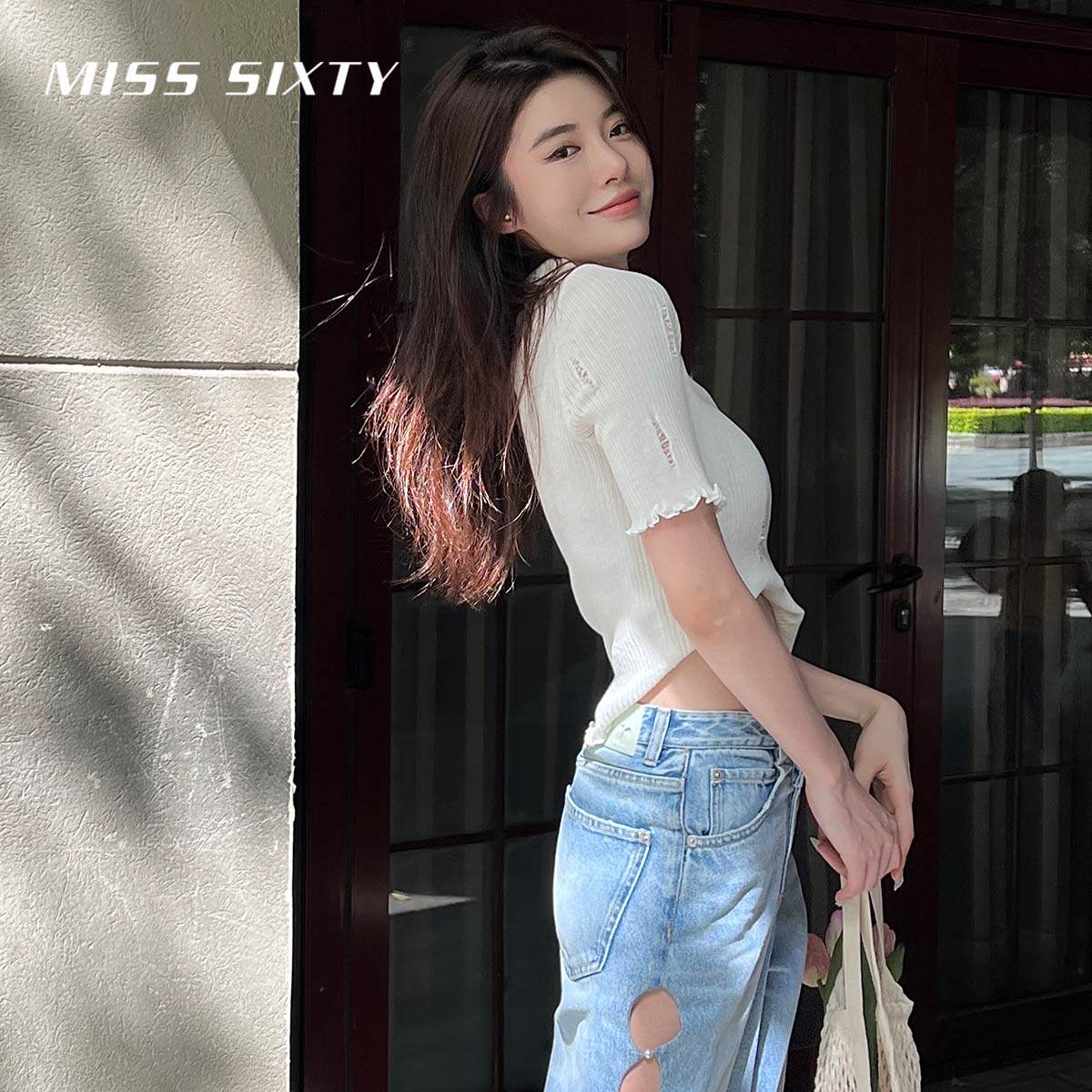 (fold up to 2 pieces 9 fold) Miss. Sixty2022 spring new stitch sweatshirt woman polo turnstile hollowed-out
