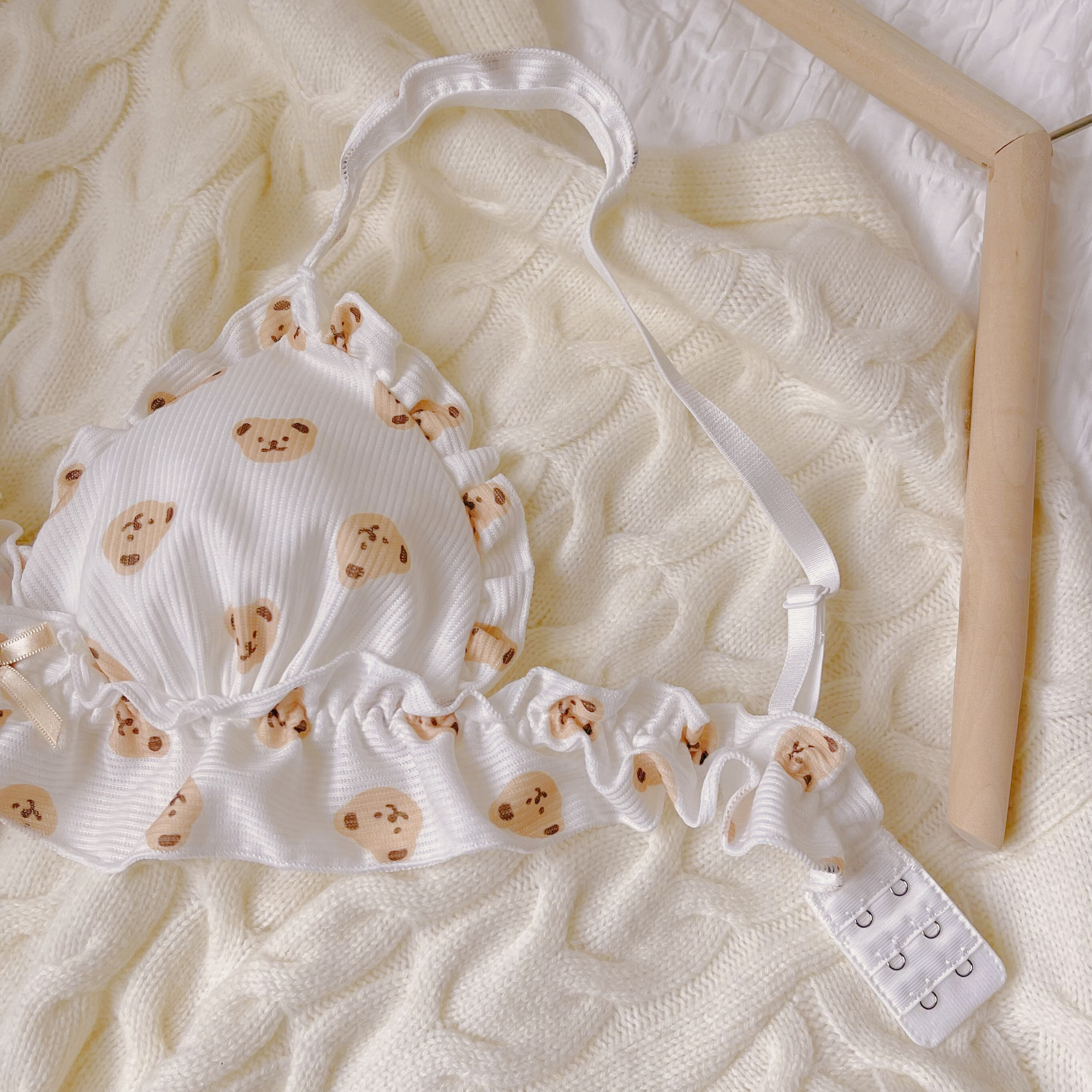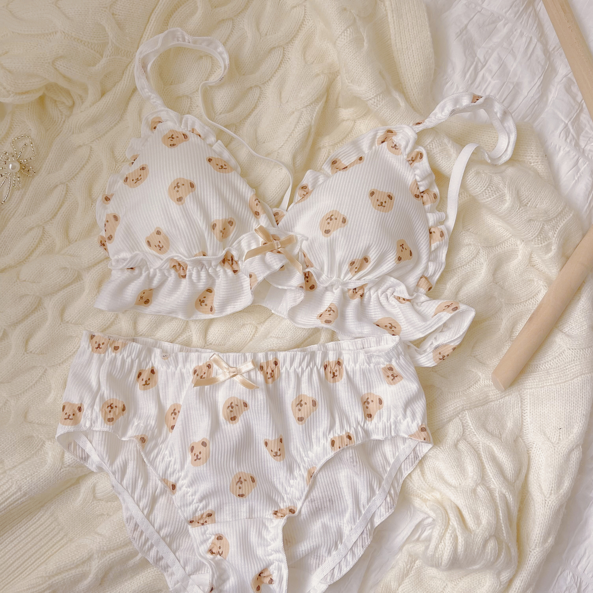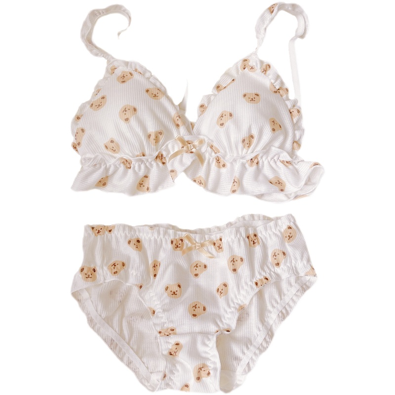 Day Ensemble Girls No Steel Ring Underwear Suit Cute Little Bear Printed Triangle Cup Small Chest Thin Bra Student New