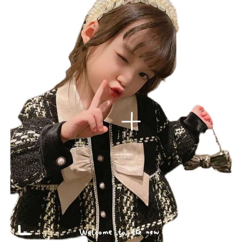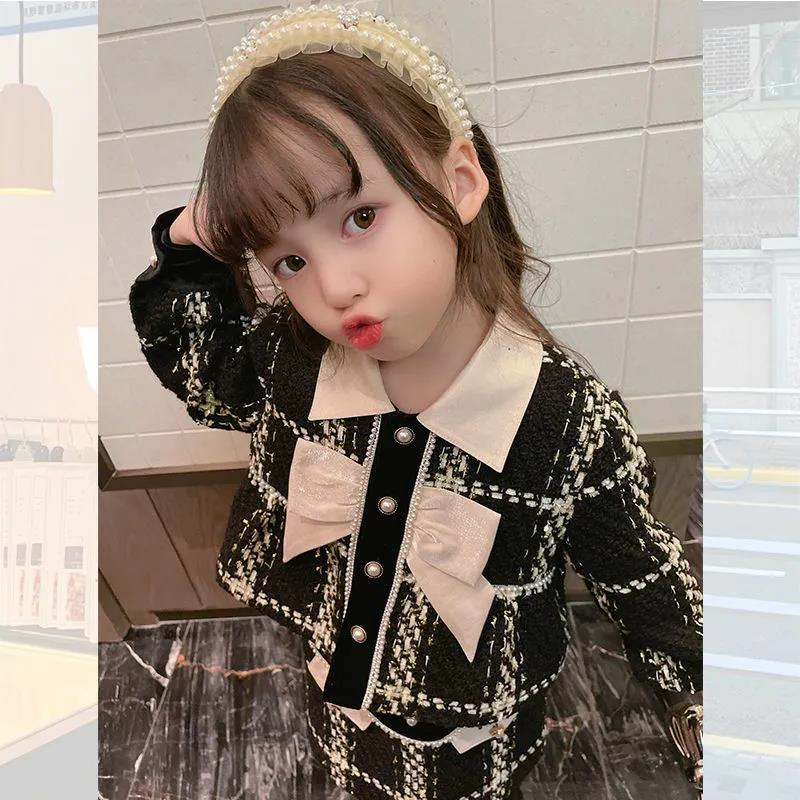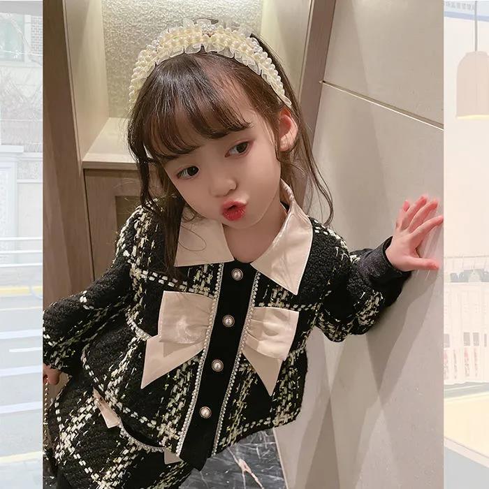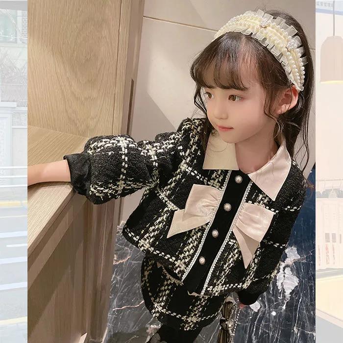 Girl Little Scents Wind Suit 2022 Spring Autumn New Temperament Bow Tie Son Two Sets Little Girl Plaid Clips Cotton