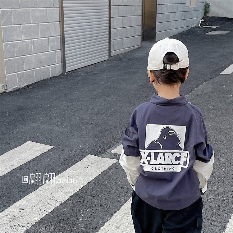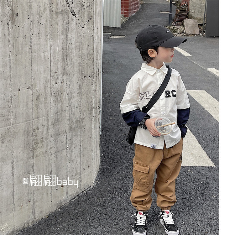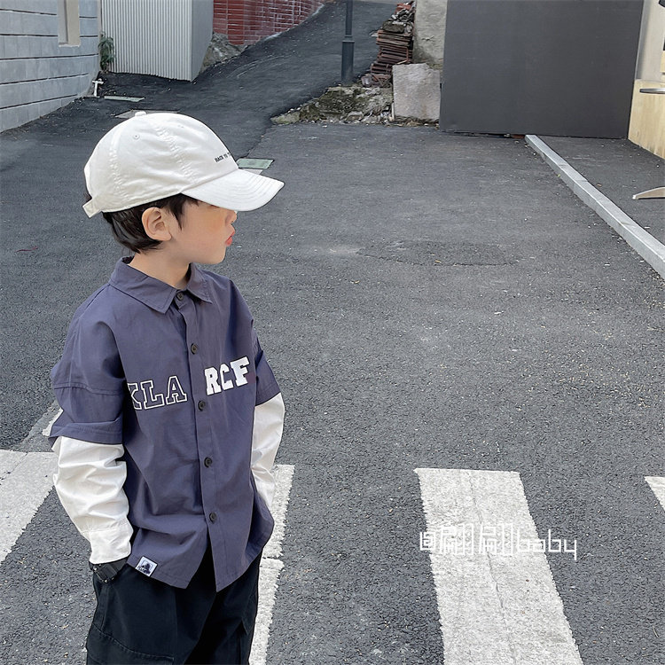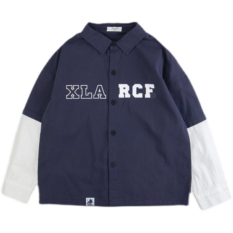 23 Spring autumn season new men's middle children's children's fashion day teshul fake two pieces of pure cotton long sleeve casual loose shirt-Taobao