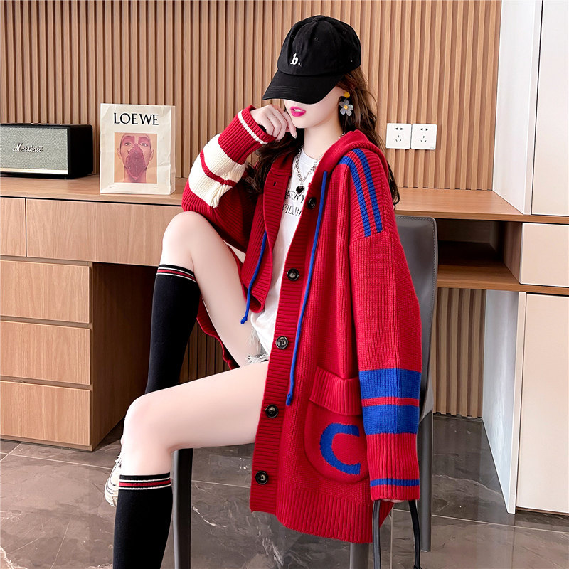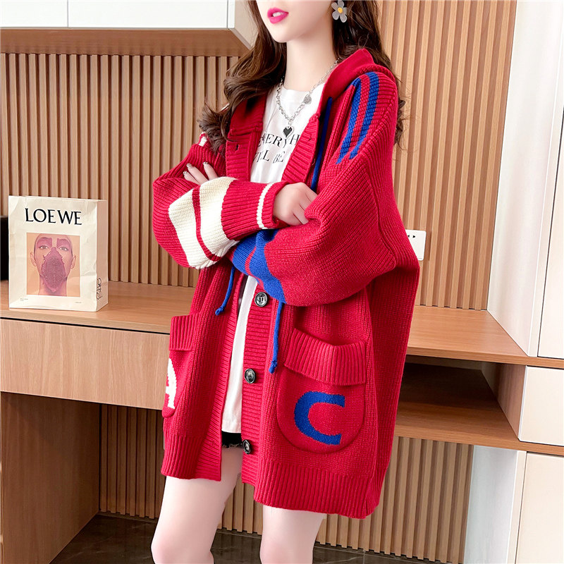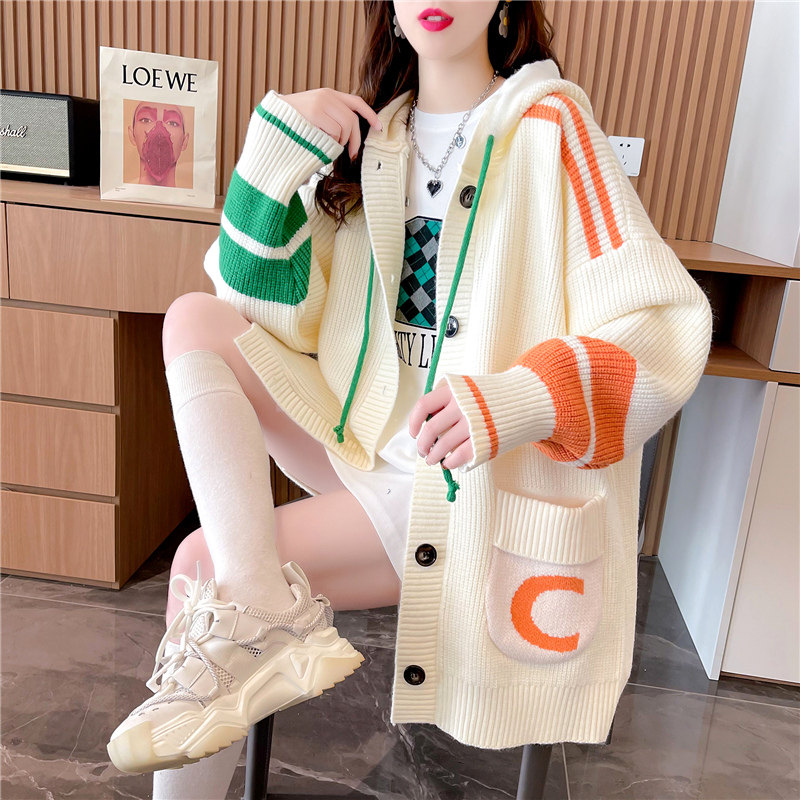 Lazy Wind Even Cap Sweater Cardigan woman medium long version Korean version 2022 new spring loose design Feel Knit Jacket