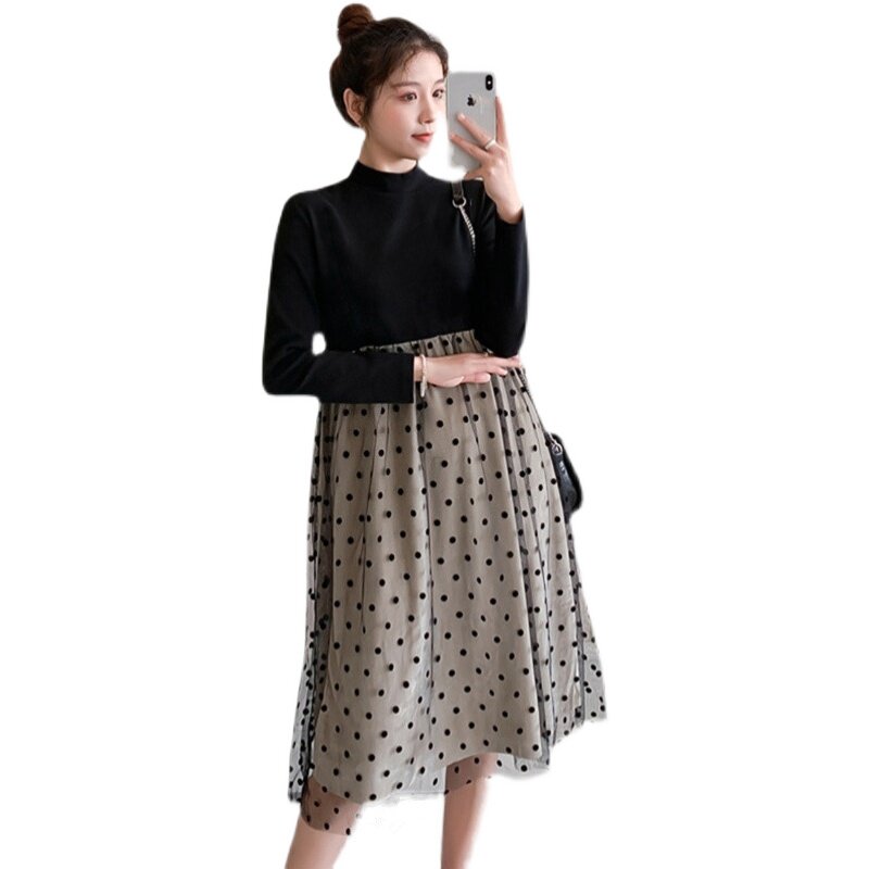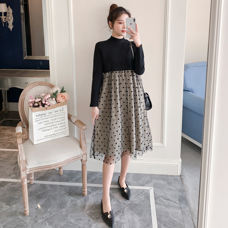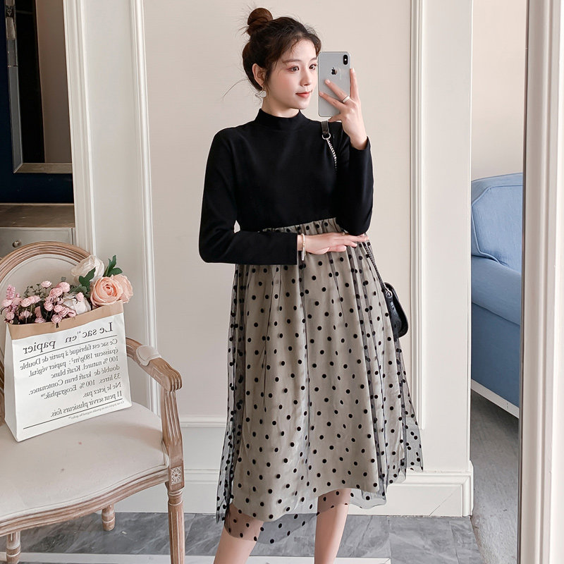 Pregnant women's spring dress red lace splicing fake two pieces of hair dress Han edition mid-long edition loose wave dot dress tops