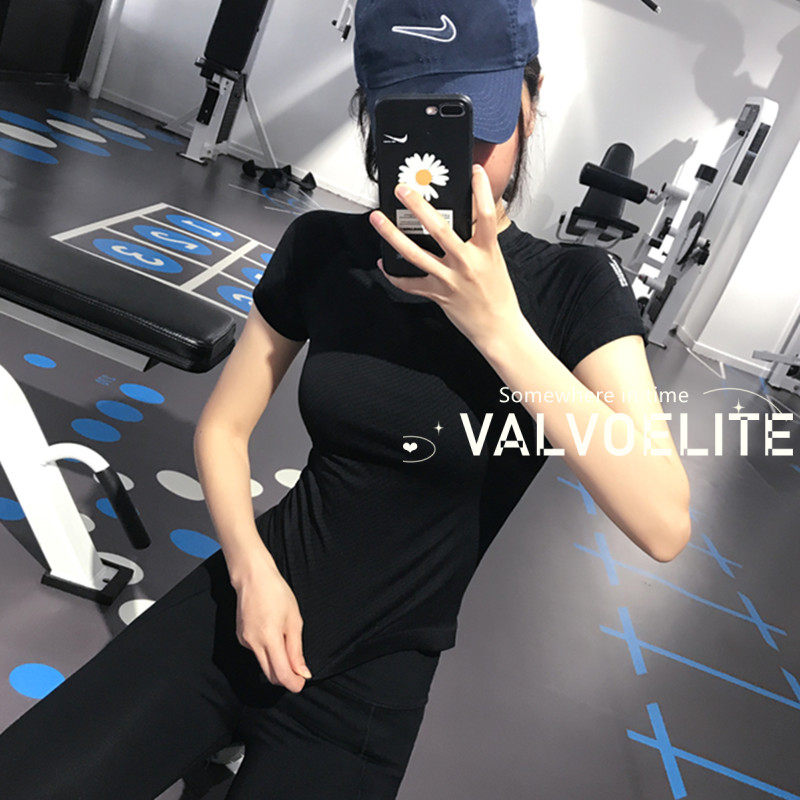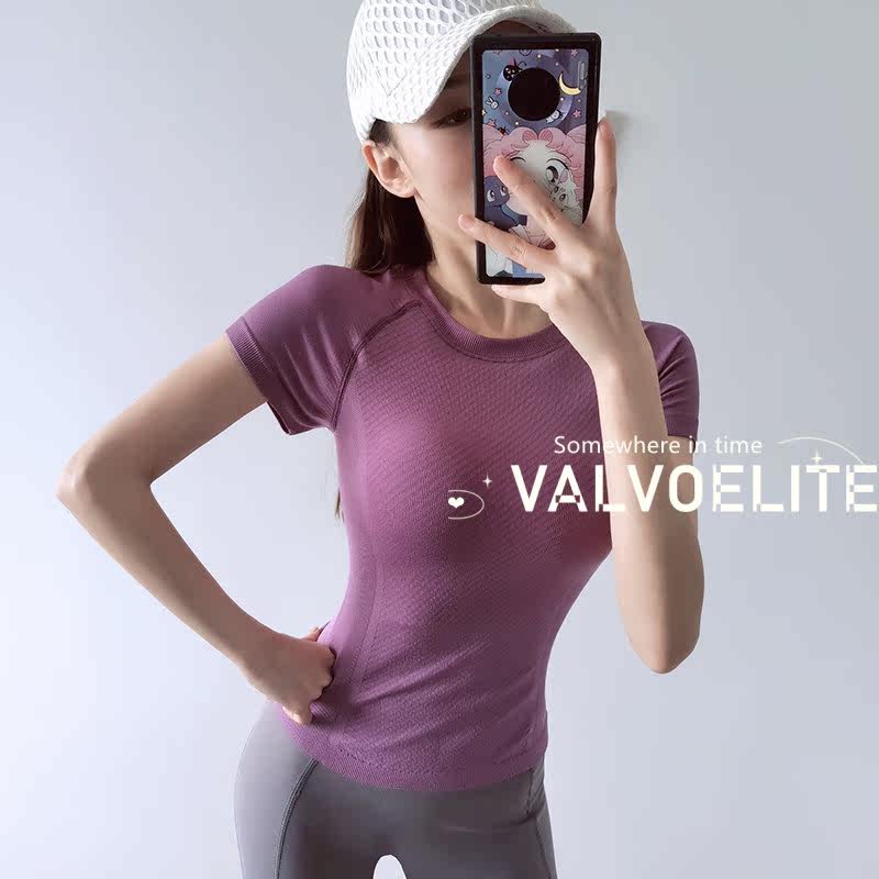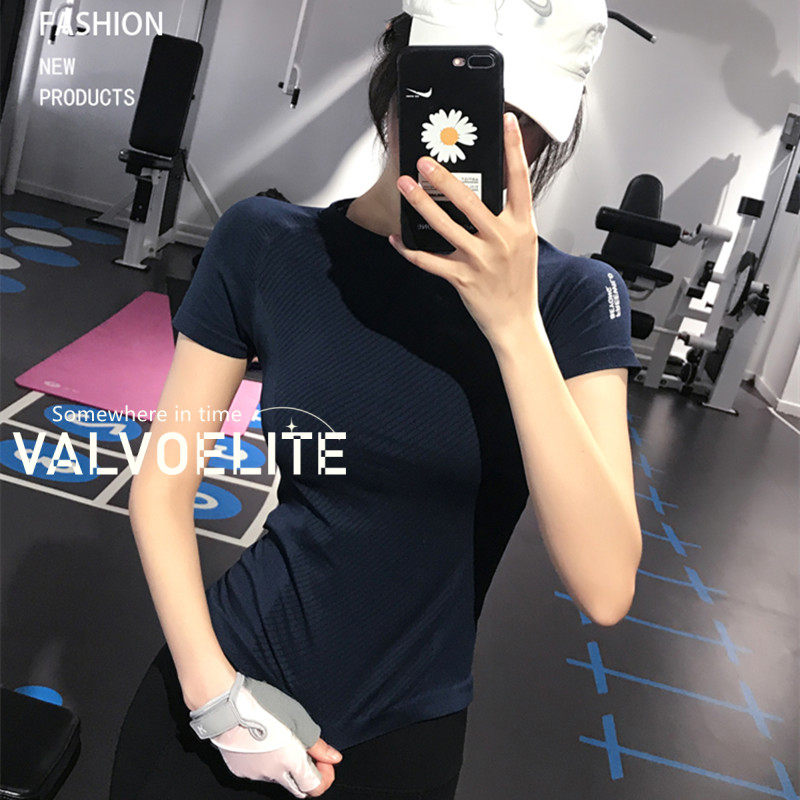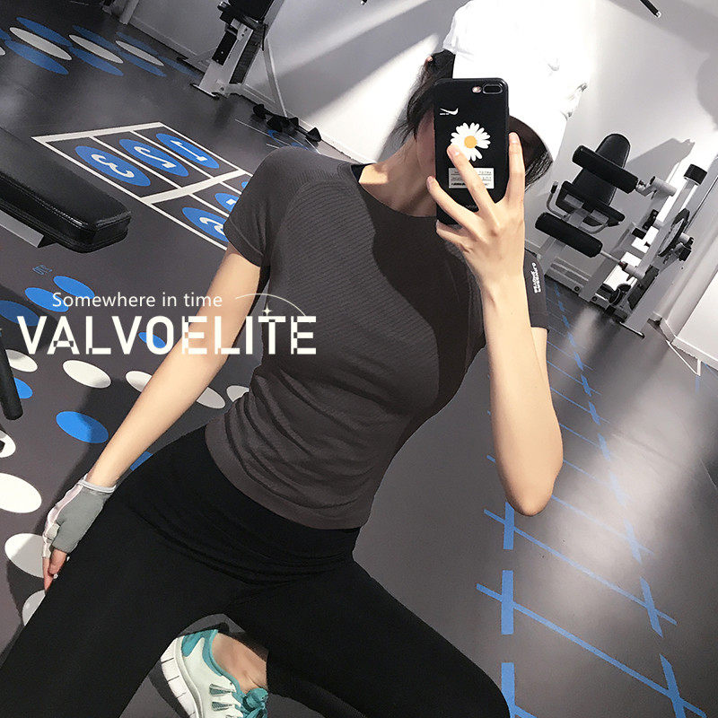 VALVOELITE Short Sleeve Sports Blouse Women Speed Dry Elastic Tight Round Collar Display Slim Running Fitness Yoga T-shirt