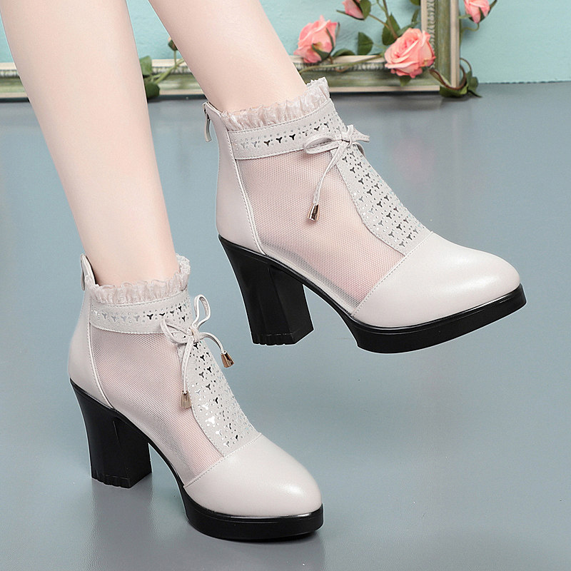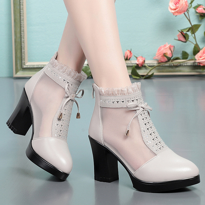 New Pindi Lcon Woman Boots Heel Leather Mesh Yarn Cool Boots High Heel Coarse Heel Short Boots Female Hollowed-out Mesh Shoes Spring Autumn Single Boots