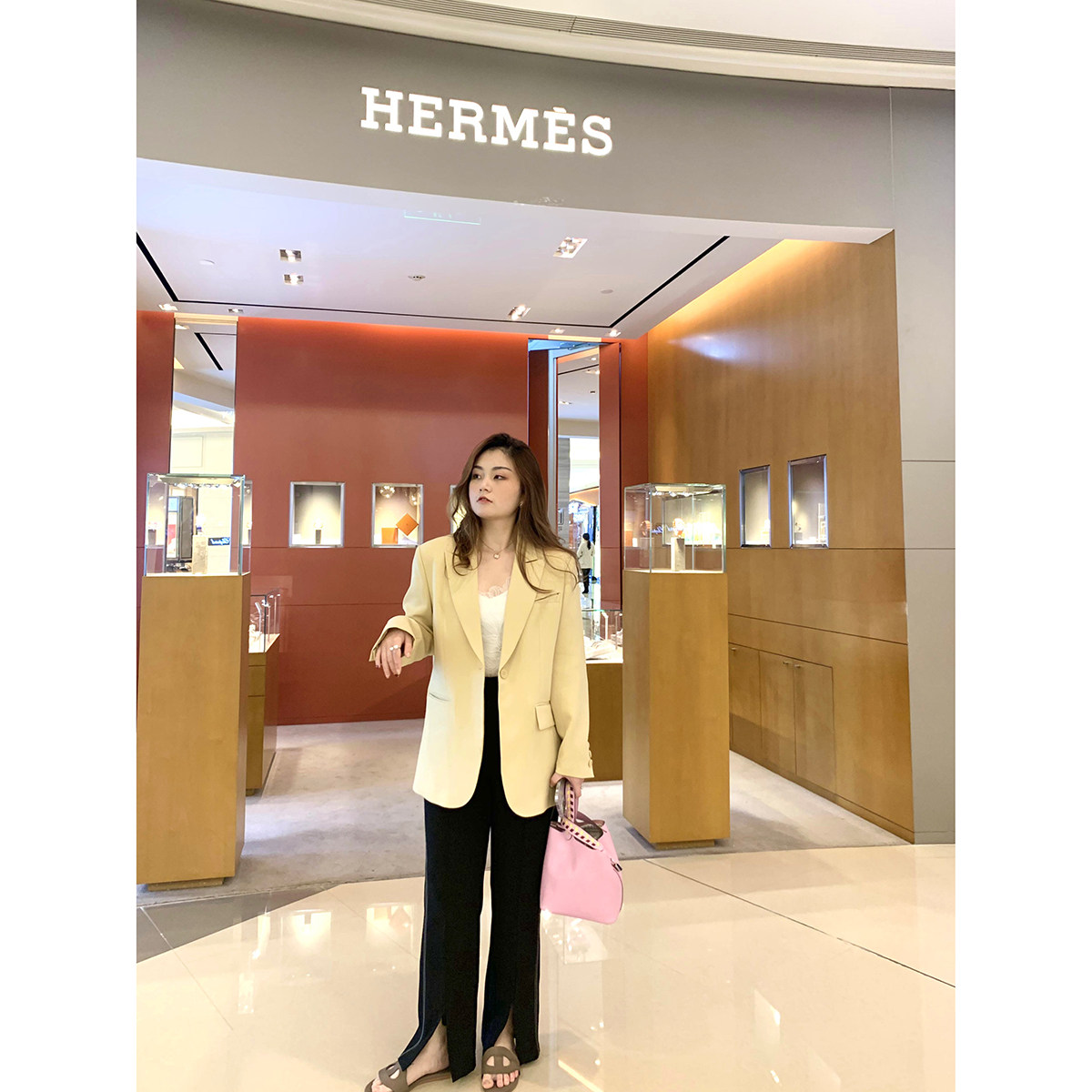 The female pants are high in the waist.: