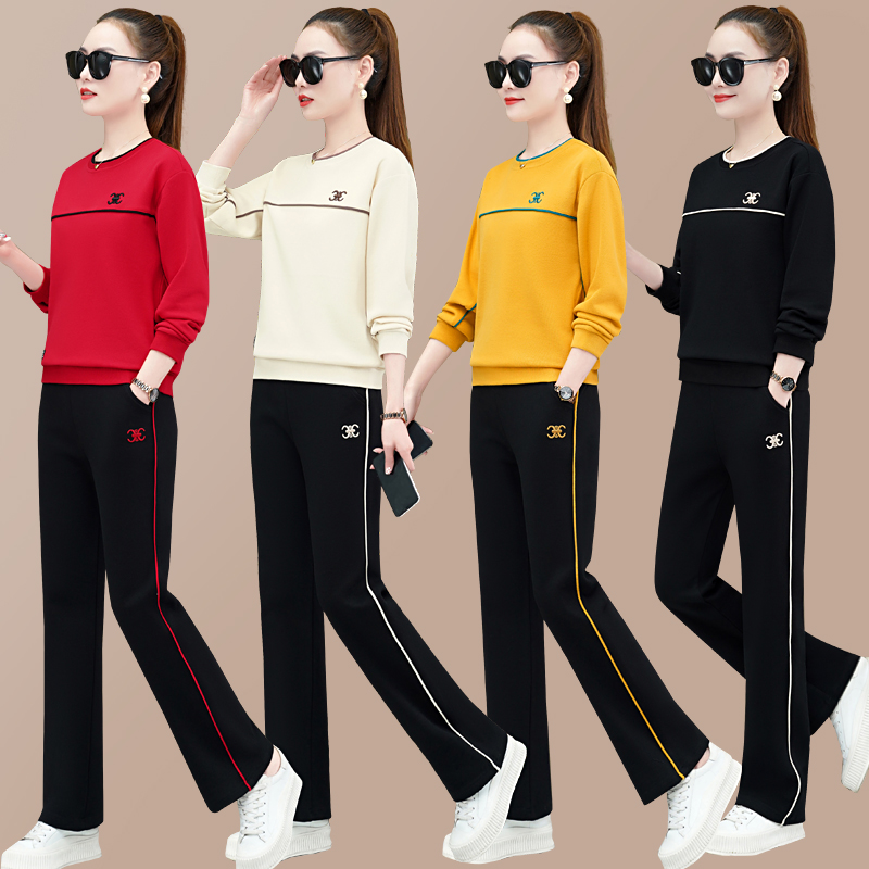 Wide-leg pants, casual sports suits, women's spring fashion, Tibetan meat, thin round neck, thick cotton T clothes, Western style two-piece fashion