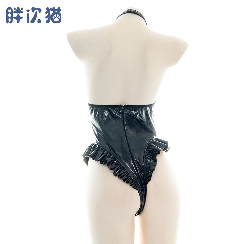 (Flush) hanging neck open chest lacquered leather Even seduces sexy lotus leaf side leather clothes Home Sleeping Clothes Photo is cool