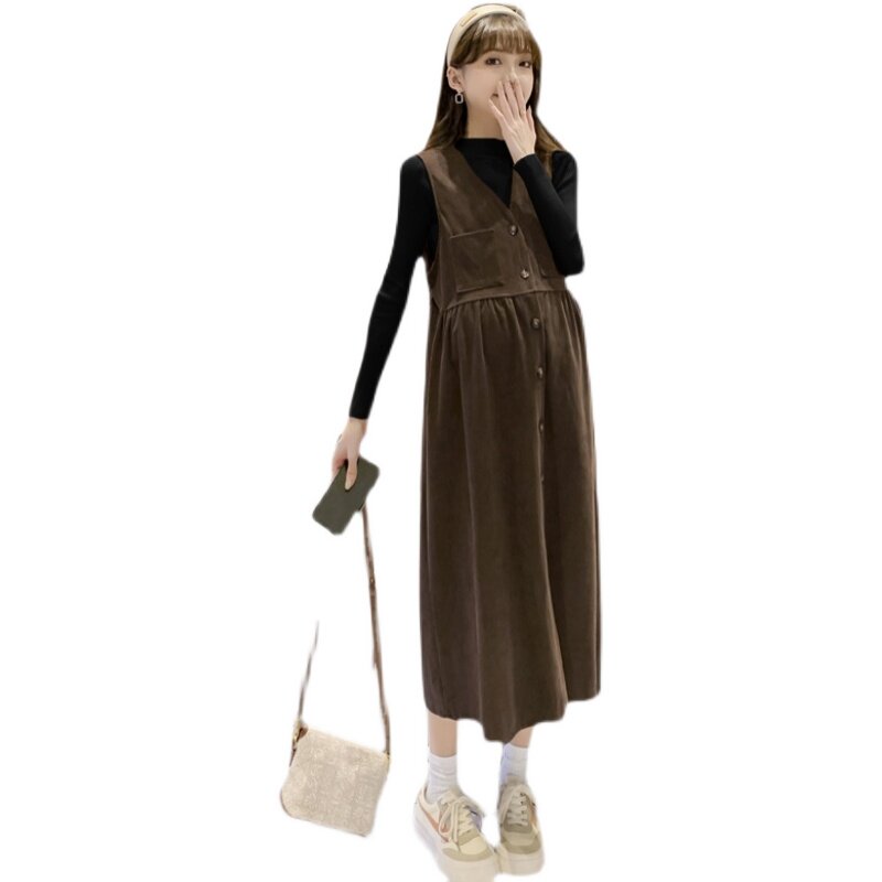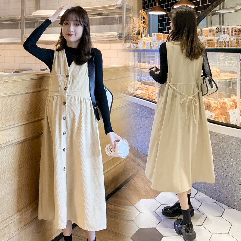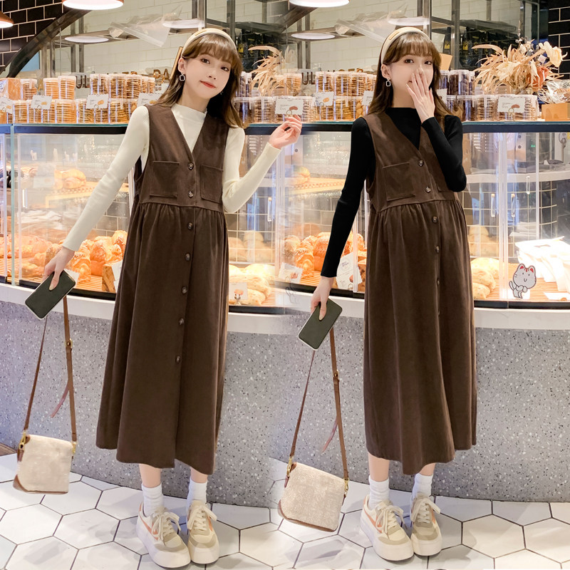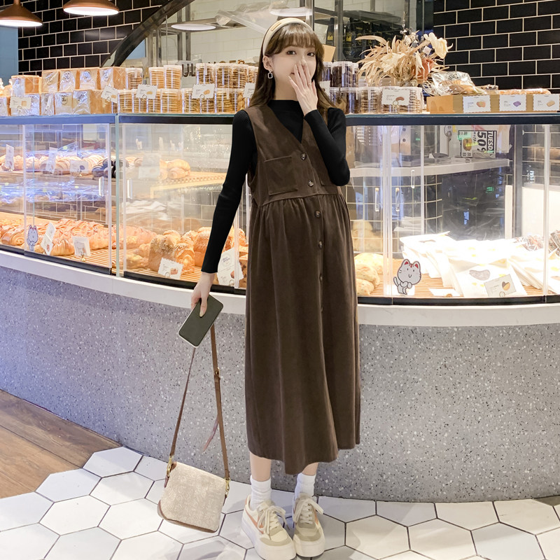 Pregnancy Woman Dress Spring Clothing in Korean version Long version Long sleeves Ocean dress lamp Core suede fashion Tidal Mommy Cuddling Bag Skirt Two-piece Style Suit