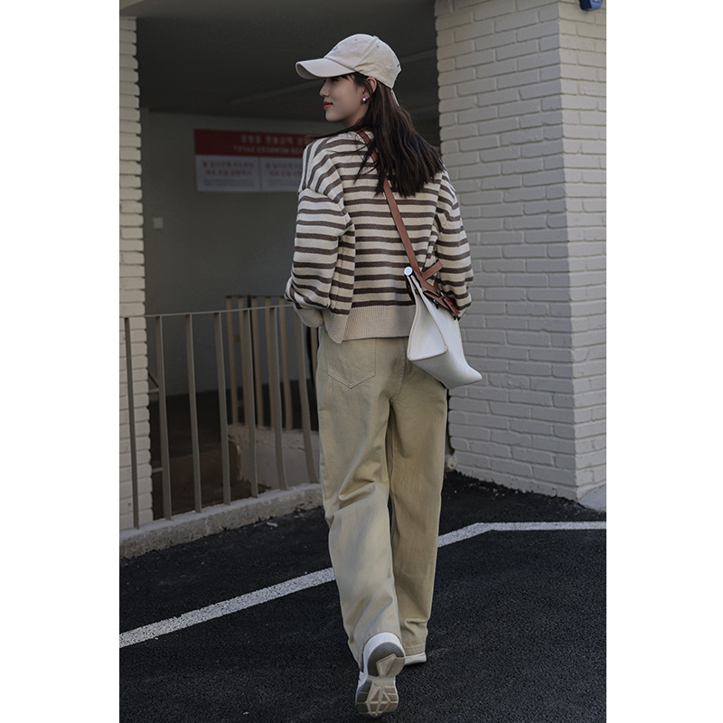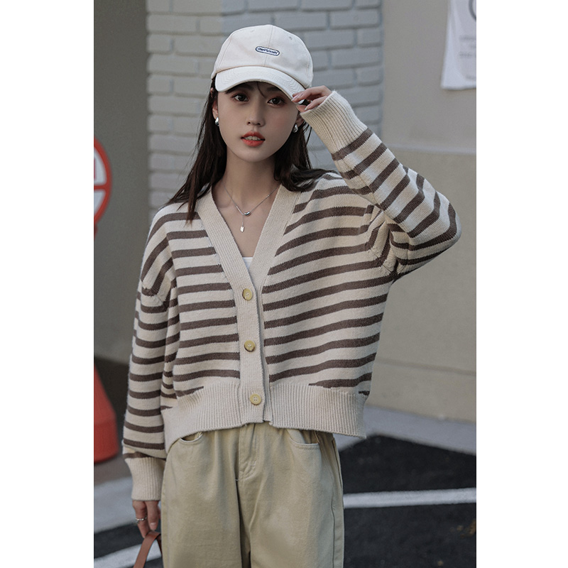 Small fragrant wind striped V-collar needlework cardigan spring blouse with lazy design feeling short version cardigan jacket sweater jacket