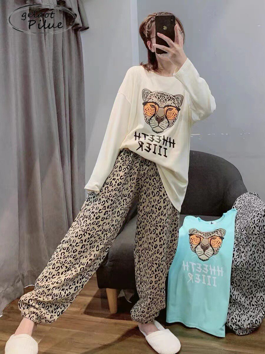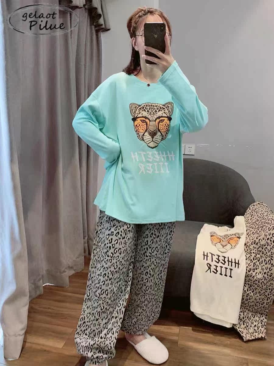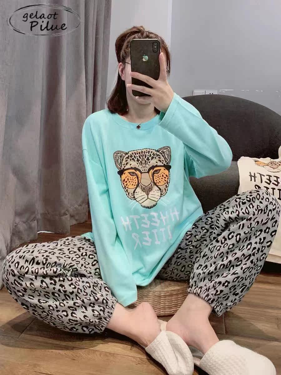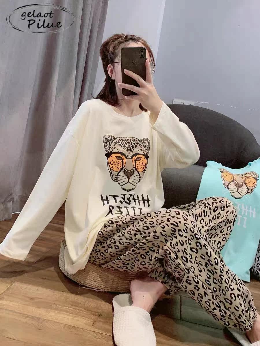 Japanese GP cartoon leopard pure cotton pajamas women's spring and autumn long-sleeved loose casual home clothes suit