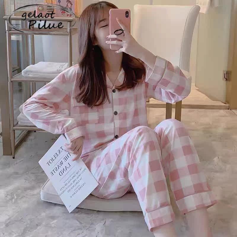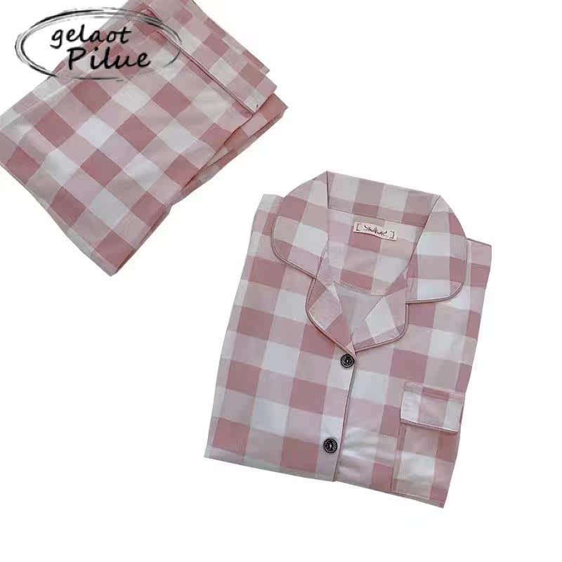 Japanese GP net red explosion style plaid spring and autumn pajamas women's long-sleeved cotton cute home clothes two-piece set