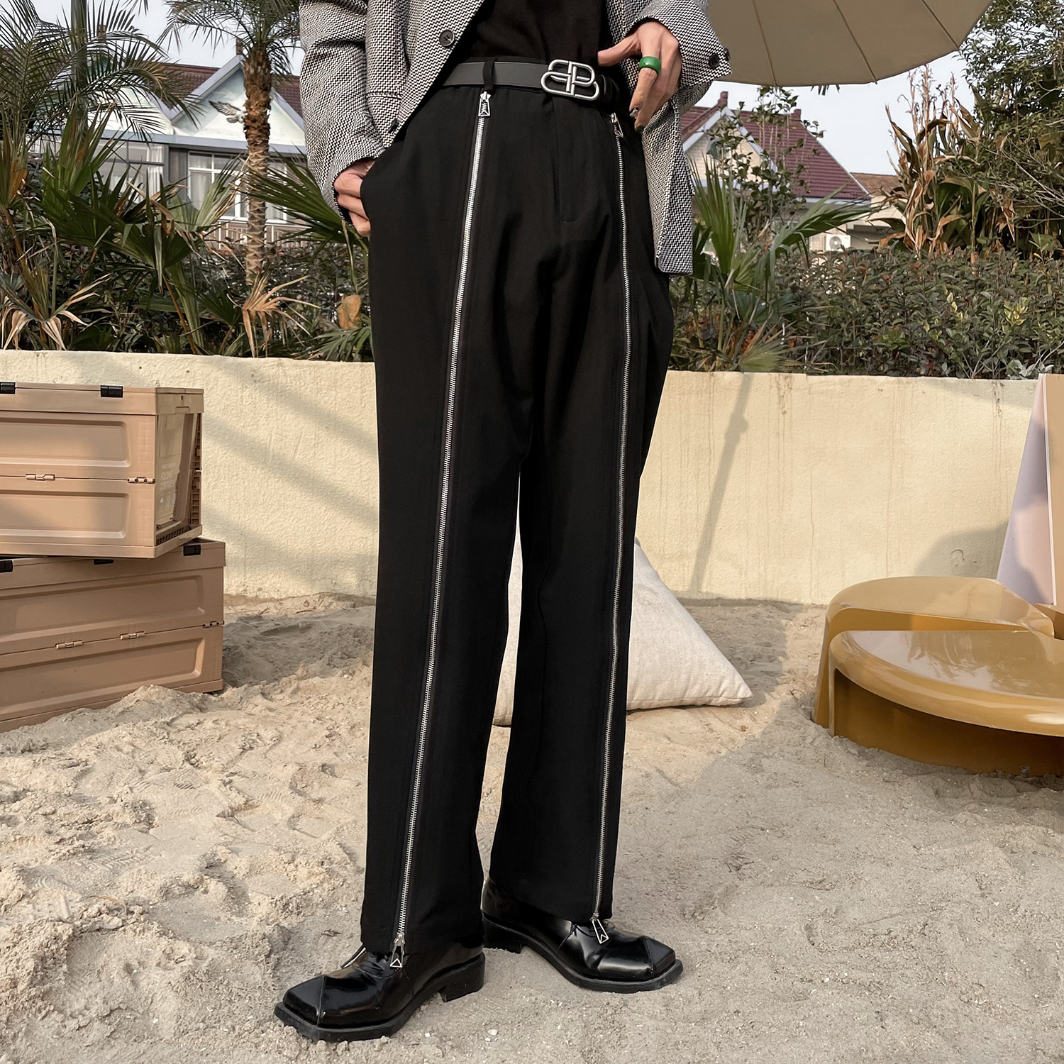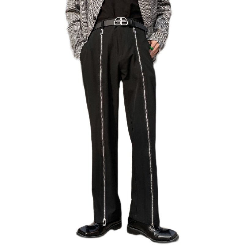 Niche design high-end men's pants Spring new men's black tide brand micro-flare pants zipper decorative casual pants