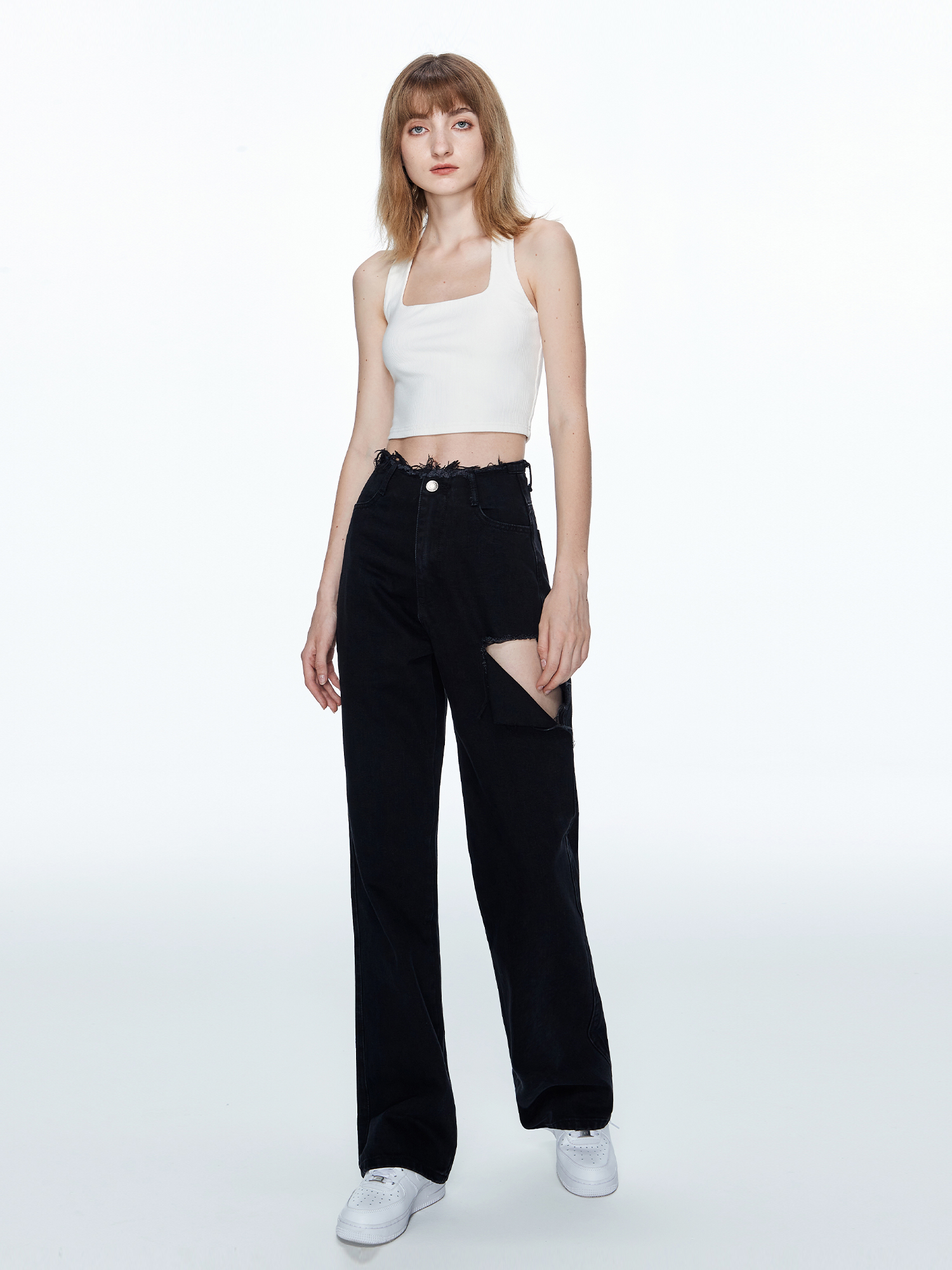 MADE NOTHING new piece of original piece of thin high waist baby straight tube loose black towed jeans woman