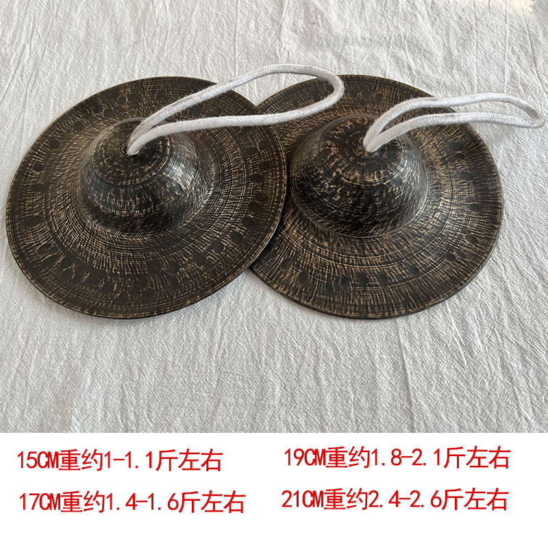 A pair of pure copper small Beijing cymbals with a diameter of 15 cm A pair of pure copper Zhongjing cymbals with a diameter of 17 cm A pair of pure copper large Beijing cymbals with a diameter of 19 cm A pair of pure copper extra large Beijing cymbals with a diameter of 21 cm
