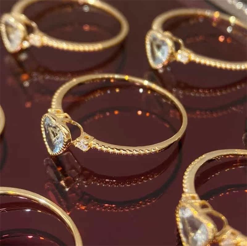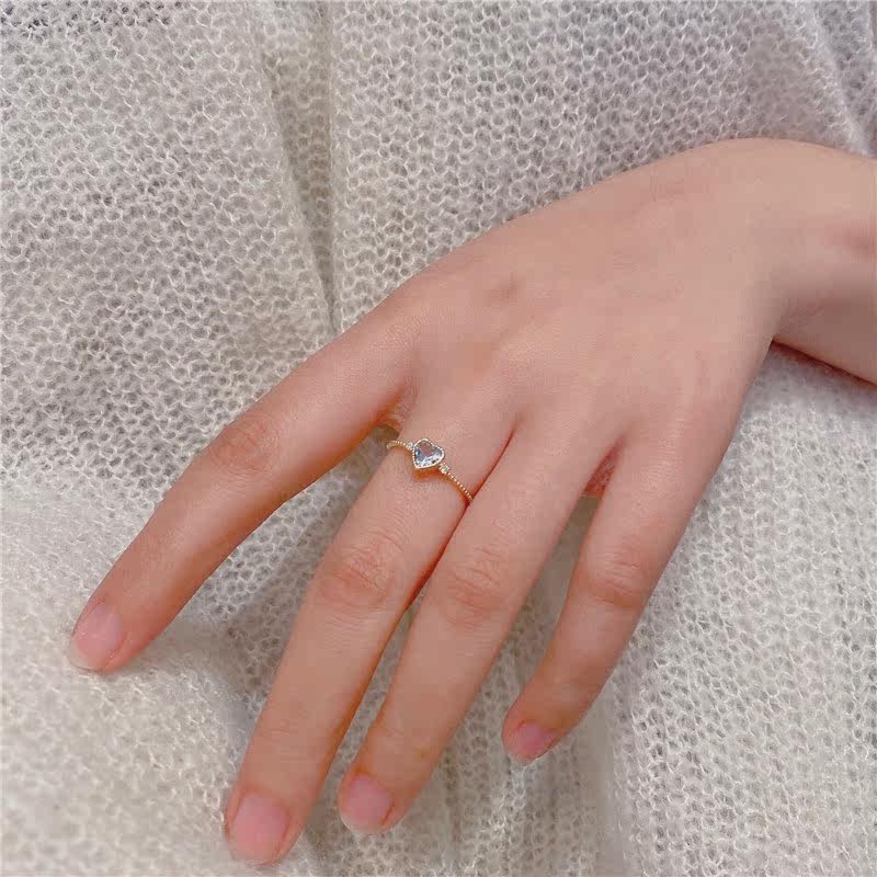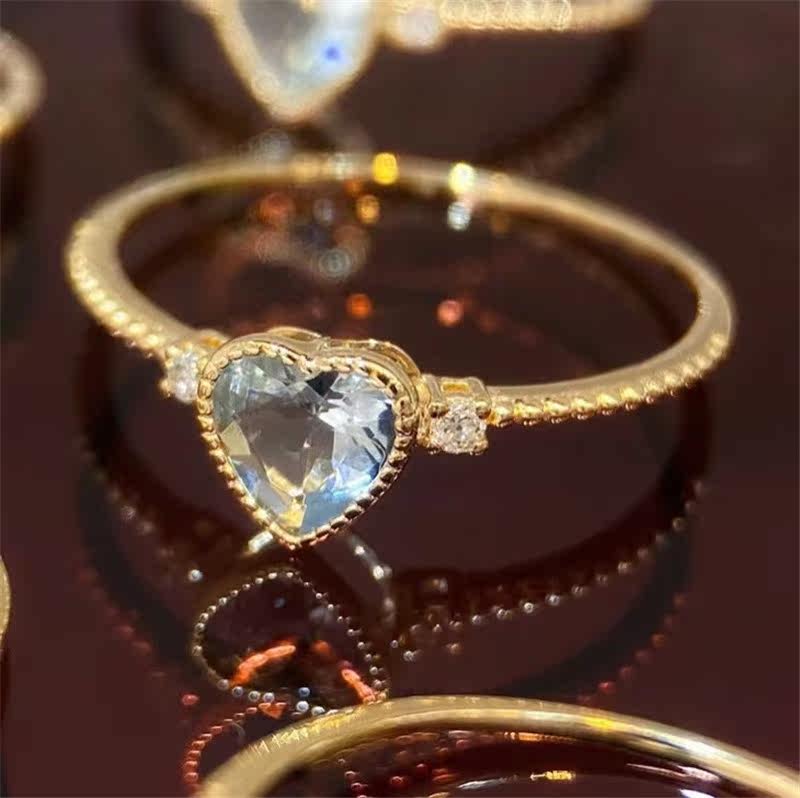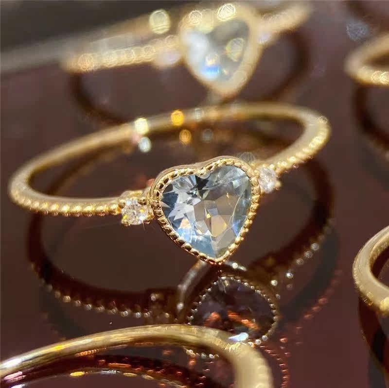 18K Gold Love Heart-shaped Sea Sapphire 35 Sub-drill 3 Ring Female Ring Arm Retro Everyday Little Clear New