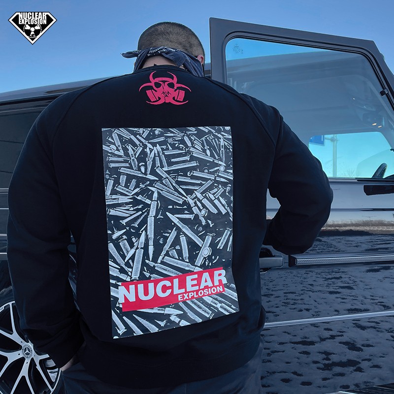 Nuclear explosion tide brand Gatling bullet print drill body casual large size raglan American black men's long-sleeved thick cotton T