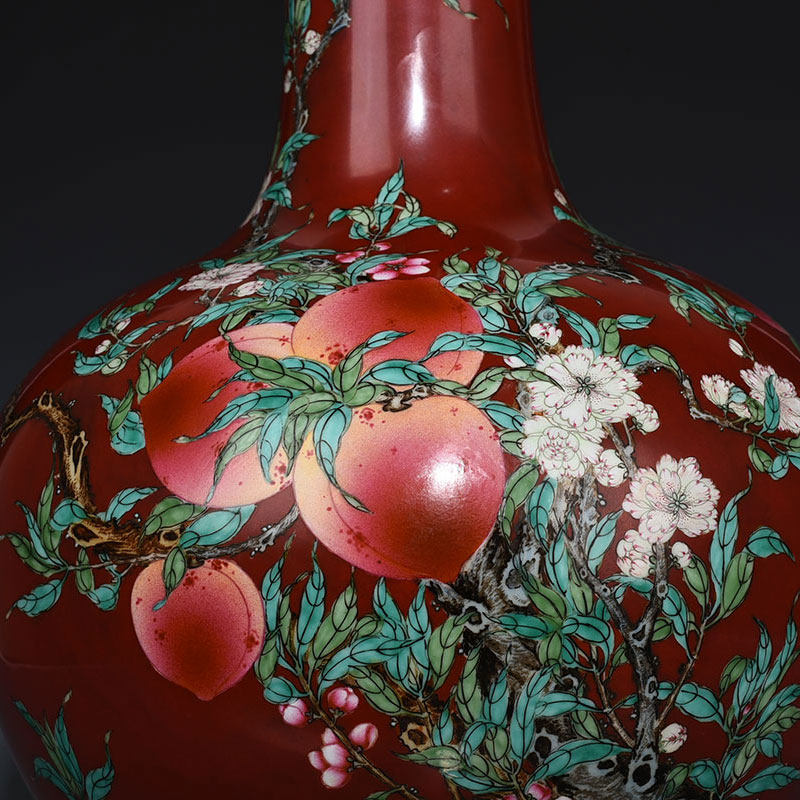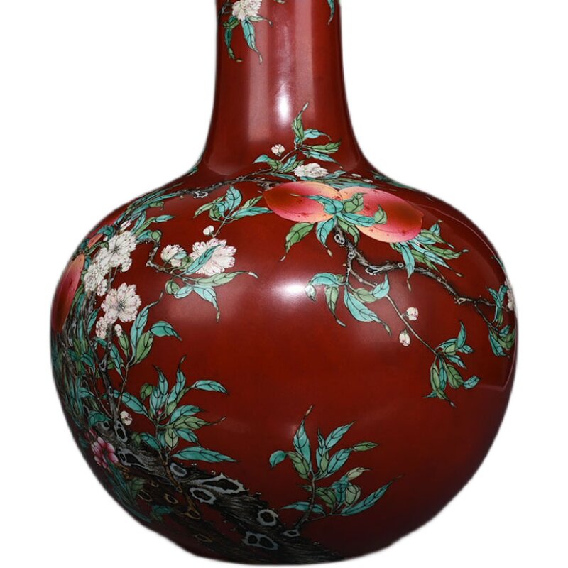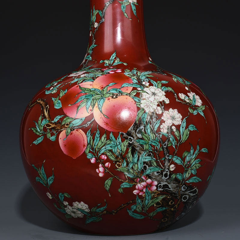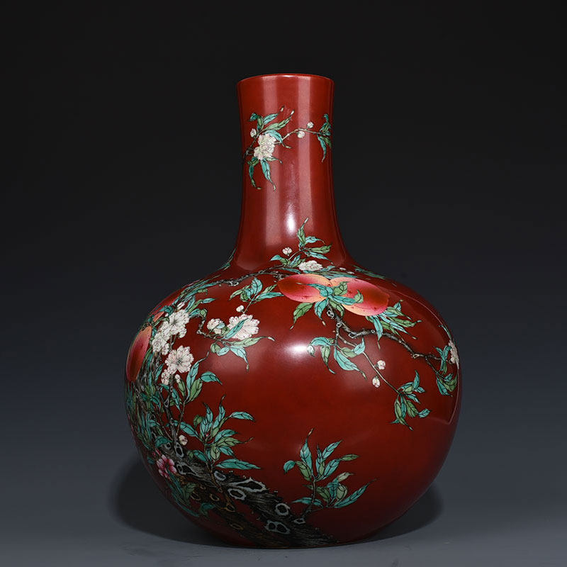 Qing Qianlong Red Ground Fen Cai Five Blessings and Nine Peach Pattern Celestial Ball Vase