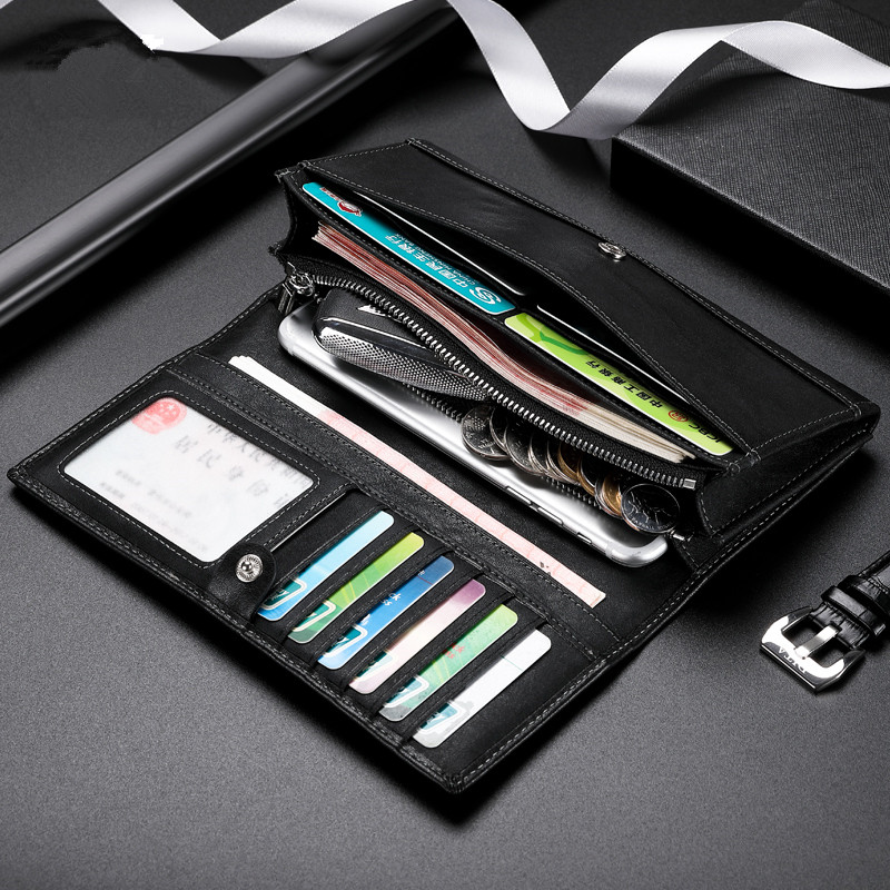 New Pure Color Large Capacity Headlayer Cow Leather Youth Ticket Clip Bull Leather Buckle Money Clip Genuine Leather Men's Long Wallet Tide
