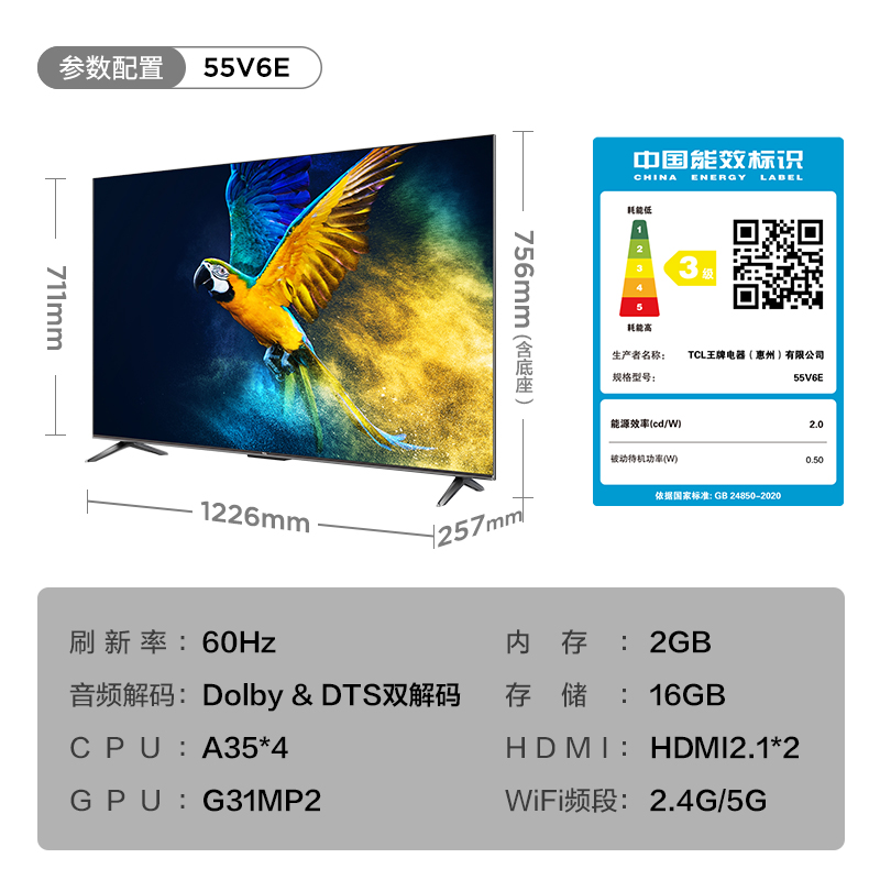 TCL 55V6E 55 inch 4K HD Smart Slim Voice Metal Full Screen Network LCD Flat Screen TV
