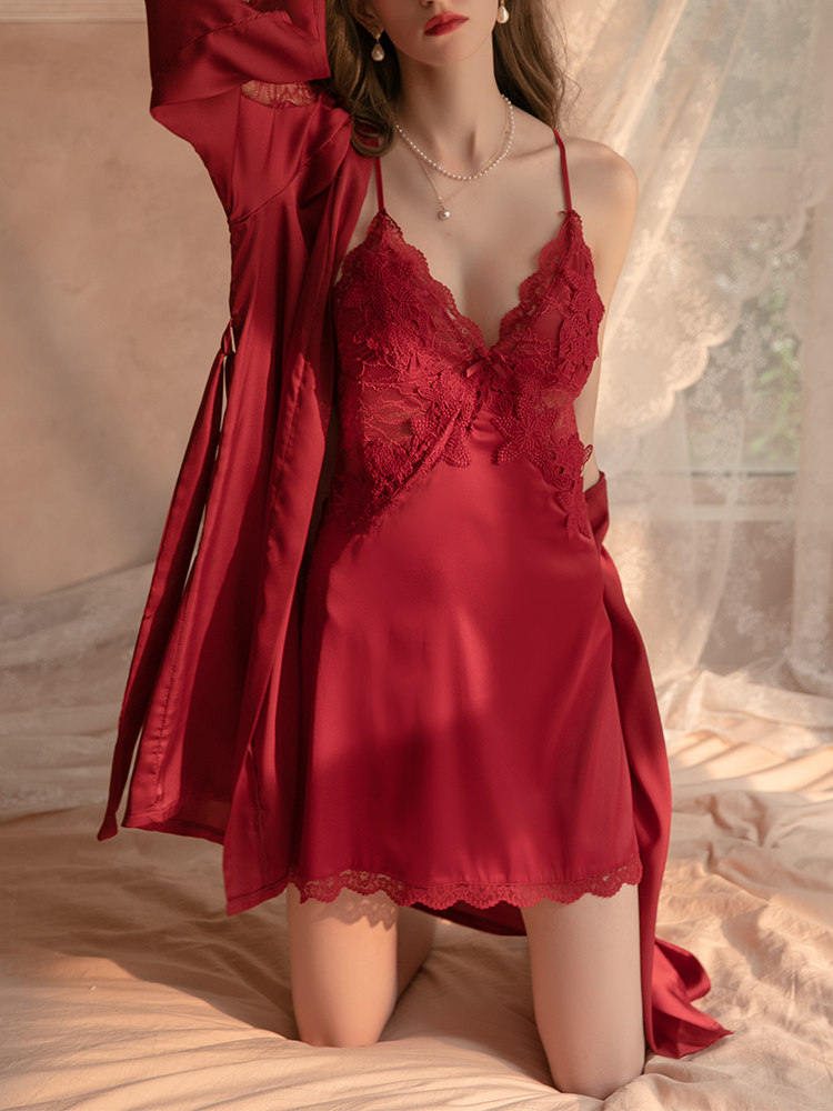 vicy pajamas women's spring and summer ice ribbon chest pad sexy lace nightgown suspenders nightdress bathrobe two-piece lace
