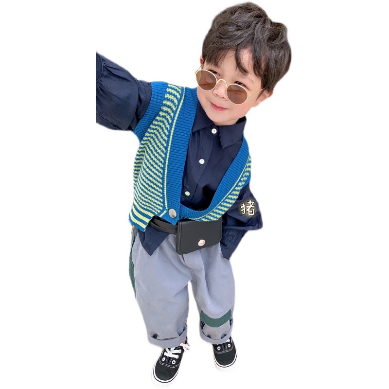 Pig Small Pie 2022 Spring Men's Children Dress Long Sleeves Shirt Knit Horse Chia Striped Casual Pocket Long Pants Suit Korea