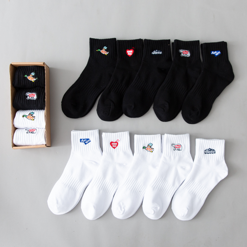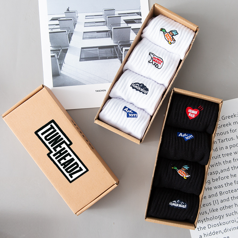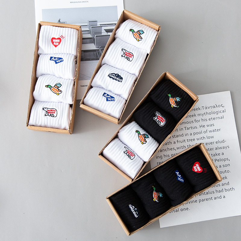 4 pairs of boxed socks men and women ins tide spring and summer socks black and white embroidered mid-tube socks cotton all-match tide socks sports