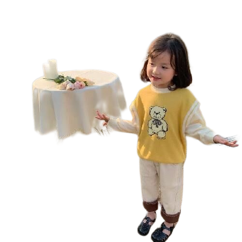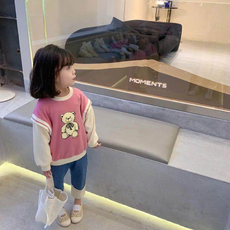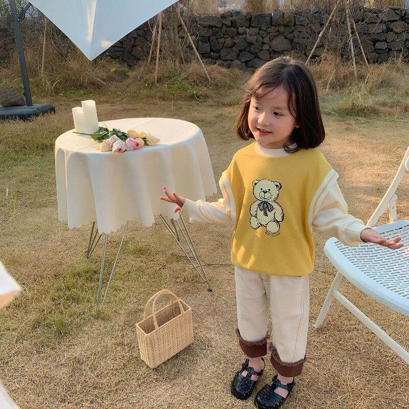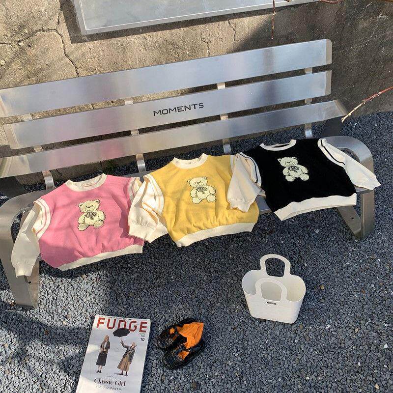 2022 girls' clothing spring new fake two-piece bear Korean version of the children's sweater baby Western style children's clothes autumn