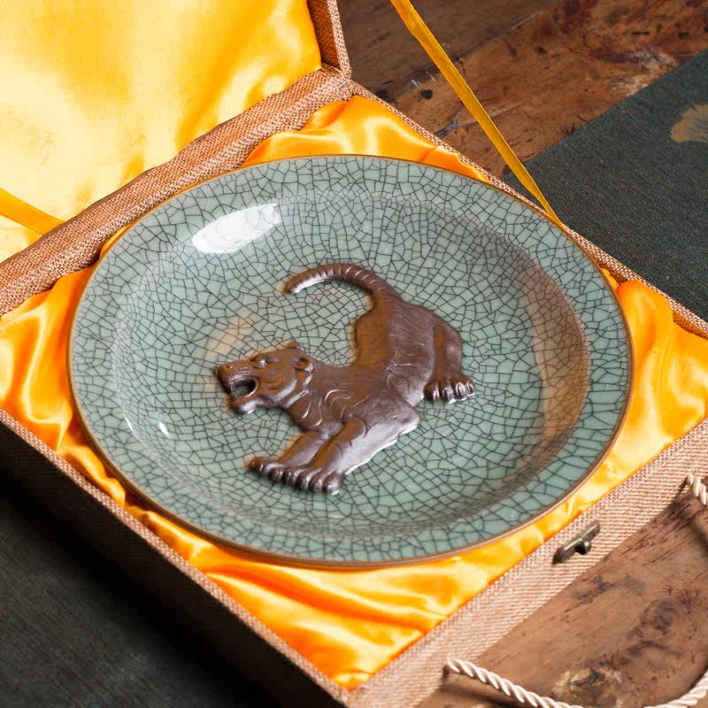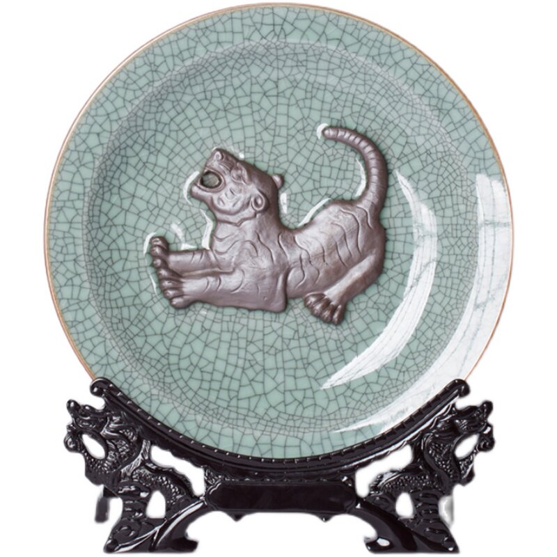 Chinese-style ceramic decoration plate Longquan celadon brother kiln ice crack tiger porcelain plate TV cabinet home decoration 25cm