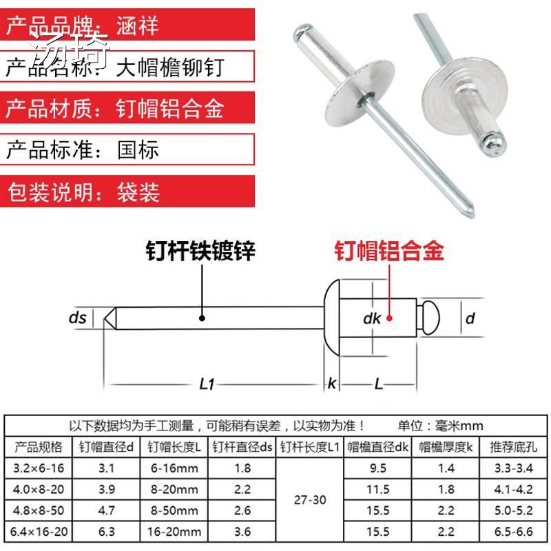 6 3mm Furnishing Doors And Windows Cap Nail Large Cap Flat Head Semicircle Adventine hat house pull-up rivet used pull lengthened