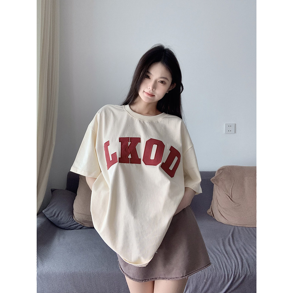 LKSTORE LKOD2022 spring summer style suede round neckline letter 100 hitch national tide casual short sleeve couple tee