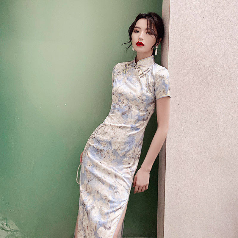 Qipao women 2021 new micro-fat collection waist display slim short sleeves Chinese wind retro improving long version of ocean clothing