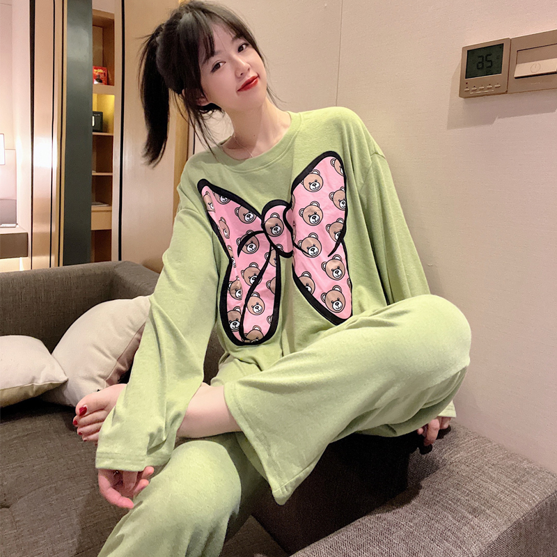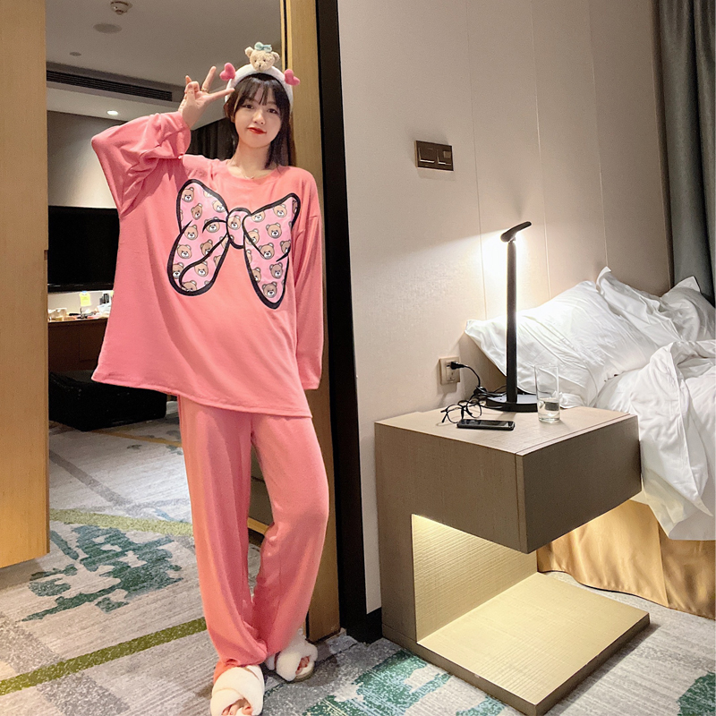 Butterfly Knot Sleepwear Woman Spring Autumn Long Sleeve Long Pants Casual Large Size Easy Round Collar Grinding Hair Extractable Suit Suit