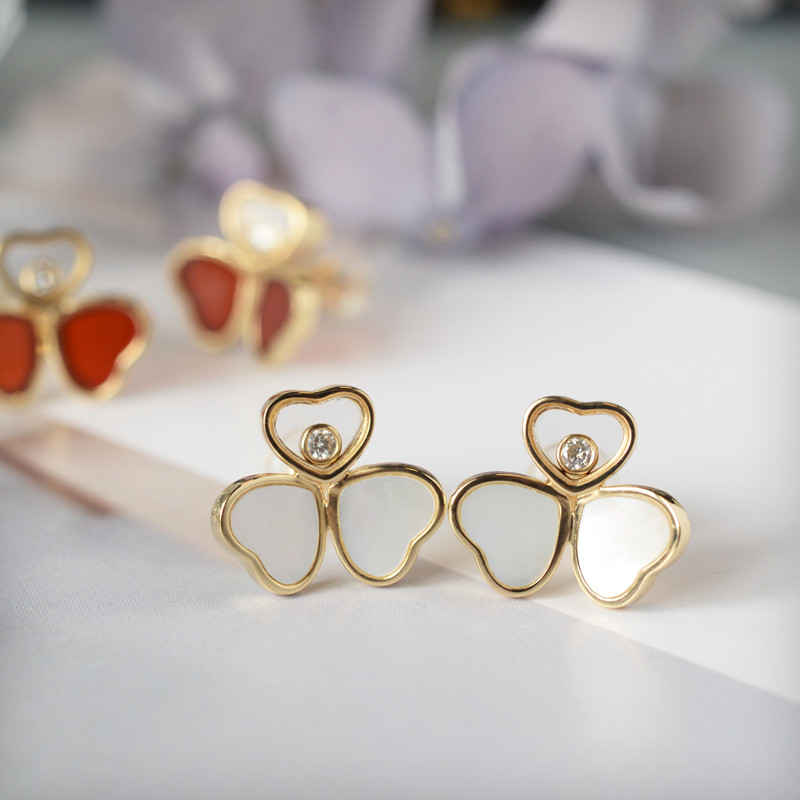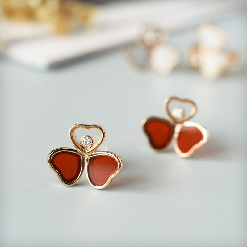 "Weijia" Classic Design Heart Wings High Jewelry 18K Gold Carnelian and Baichuan Fritillaria Stud Earrings with Diamonds