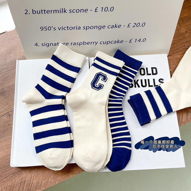 Ultra 100 lap college wind cotton socks female midcylinder spring and autumn blue streaks in cylinder socks with sweat and air