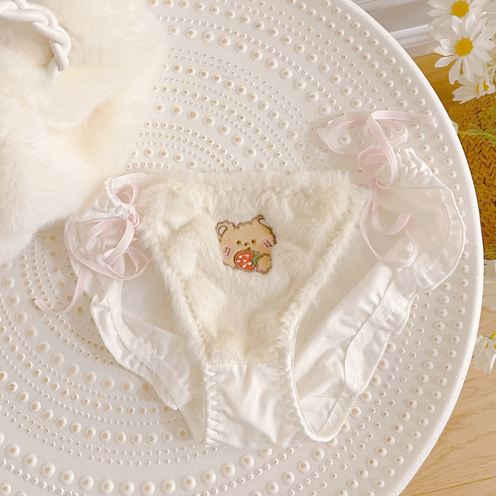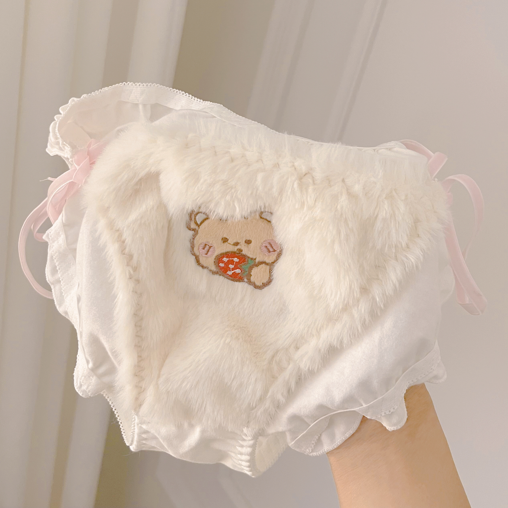 Underwear women's cute plush bear print girls briefs low waist sexy lace-up ladies bottoms winter new