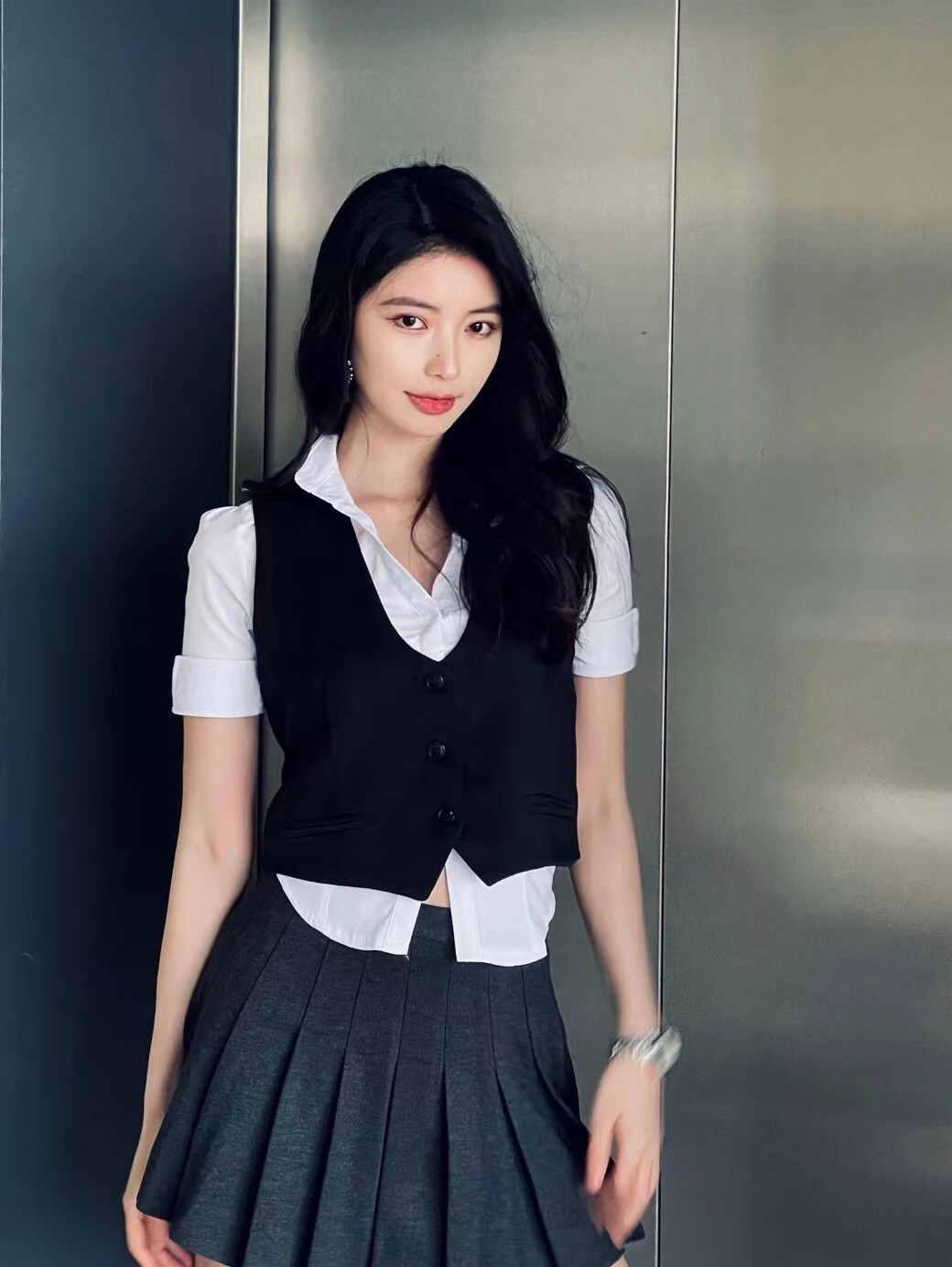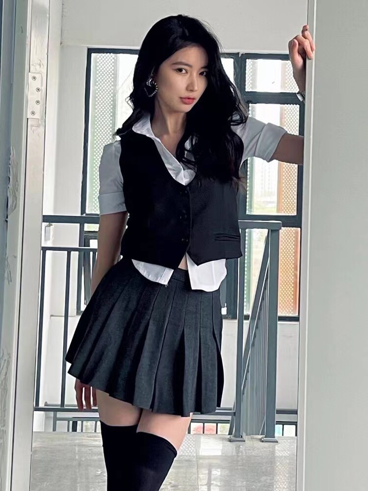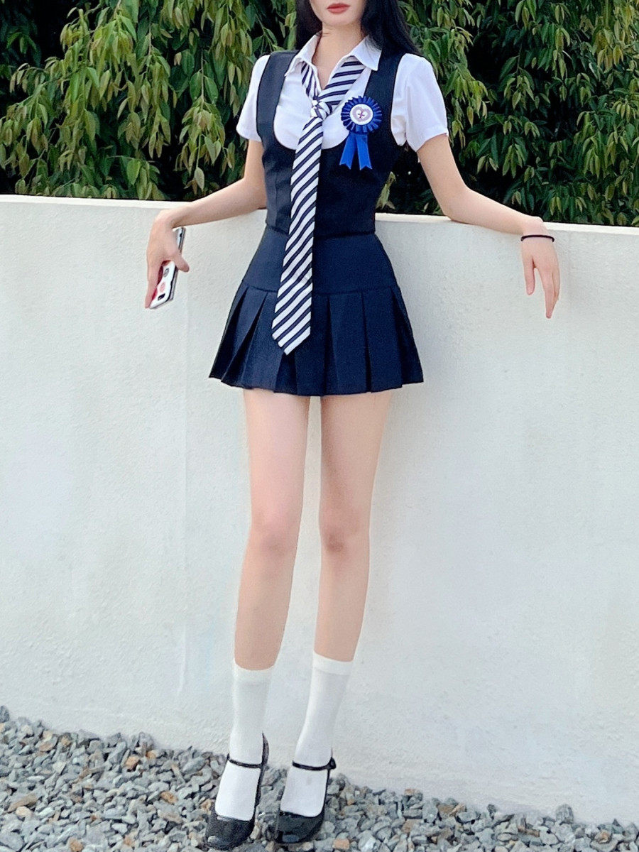 Suit Vest Skirt Suit Vest Skirt Long Sleeve Shirt Suit Vest Skirt Short Sleeve Shirt Suit Vest Grey Skirt Short Sleeve Shirt Closeup Short Sleeve White Shirt