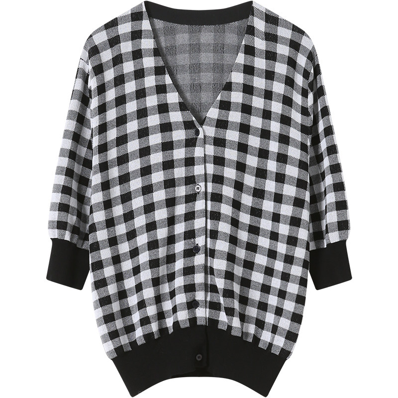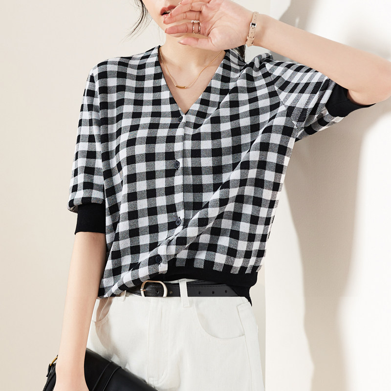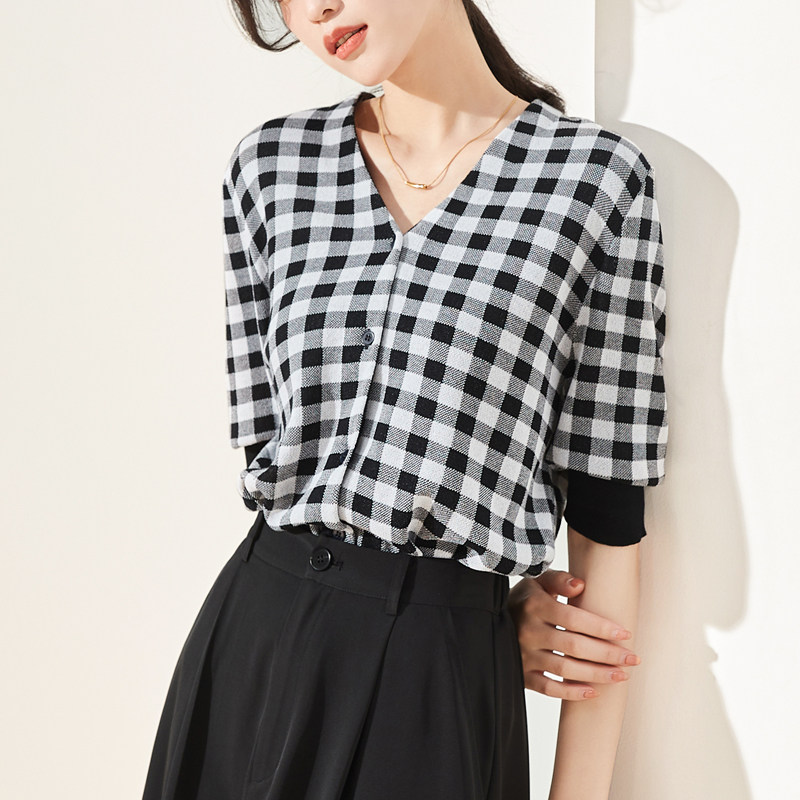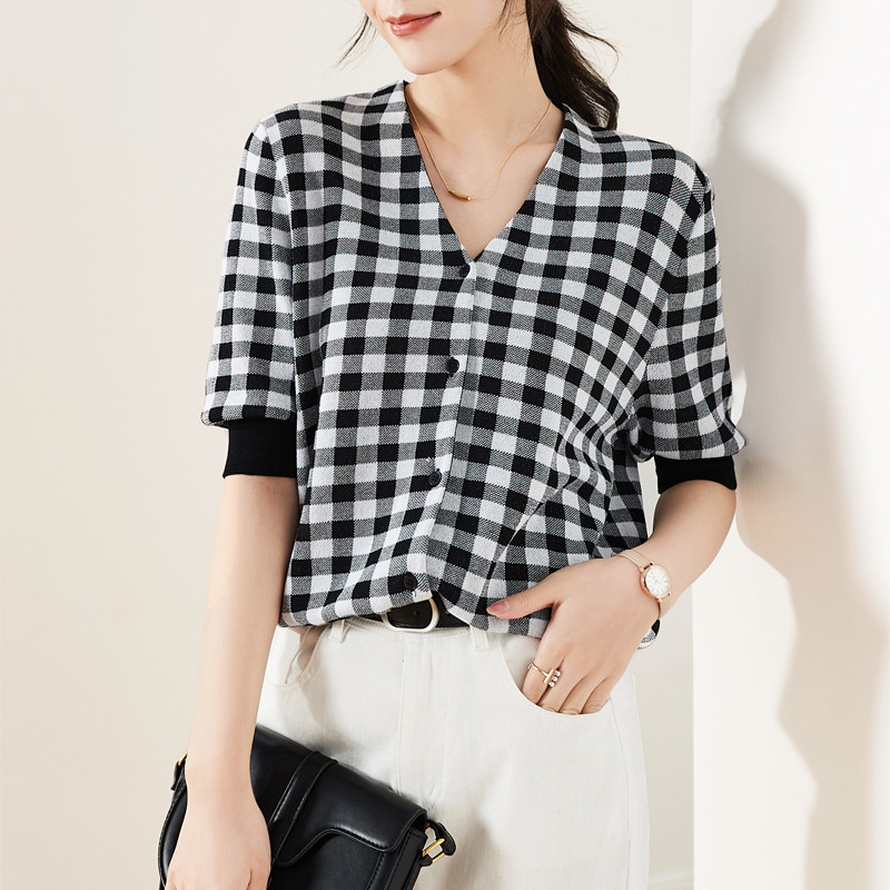 Sophie Plaid Plaid Knitwear Woman 2022 Spring Summer New V Collar Short Sleeve Open Flap Jacket Fashion Jacket Undershirt
