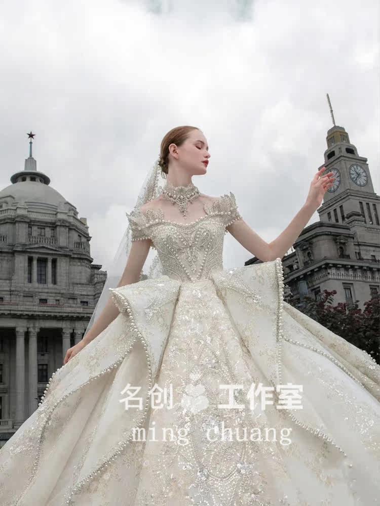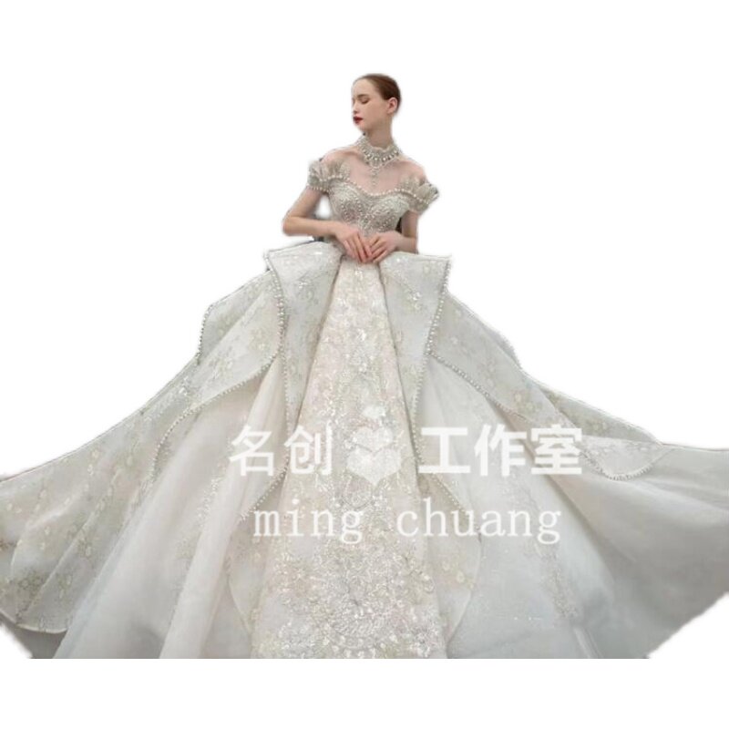 Straight Shoulder Wedding Dress 2021 Bride New main wedding dress French style Hepburn Grand trailing main yarn Senior lavish Heavy Industries
