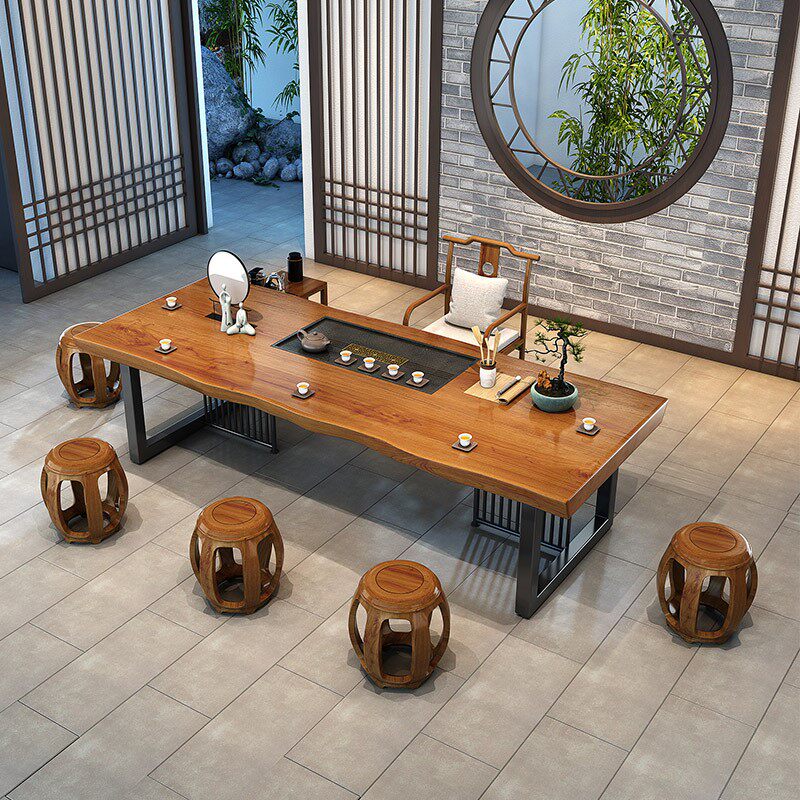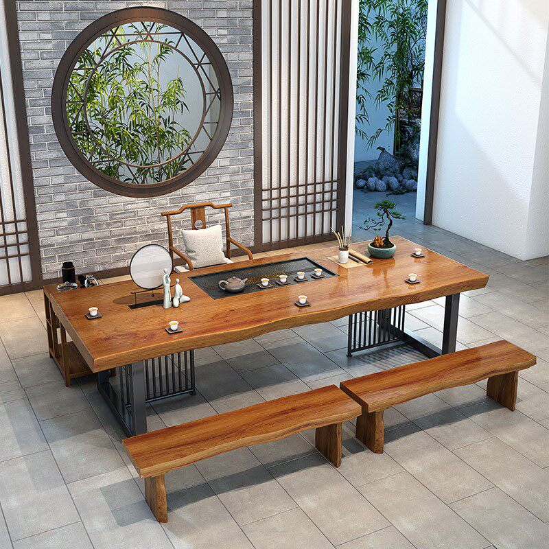 New Chinese-style solid wood tea table and chair combination meeting room log Zen coffee table commercial iron rectangular kung fu tea table