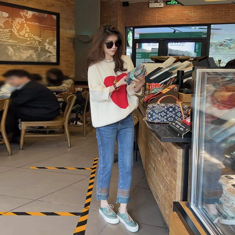 The apricot-coloured sweater blue pants in the blue
