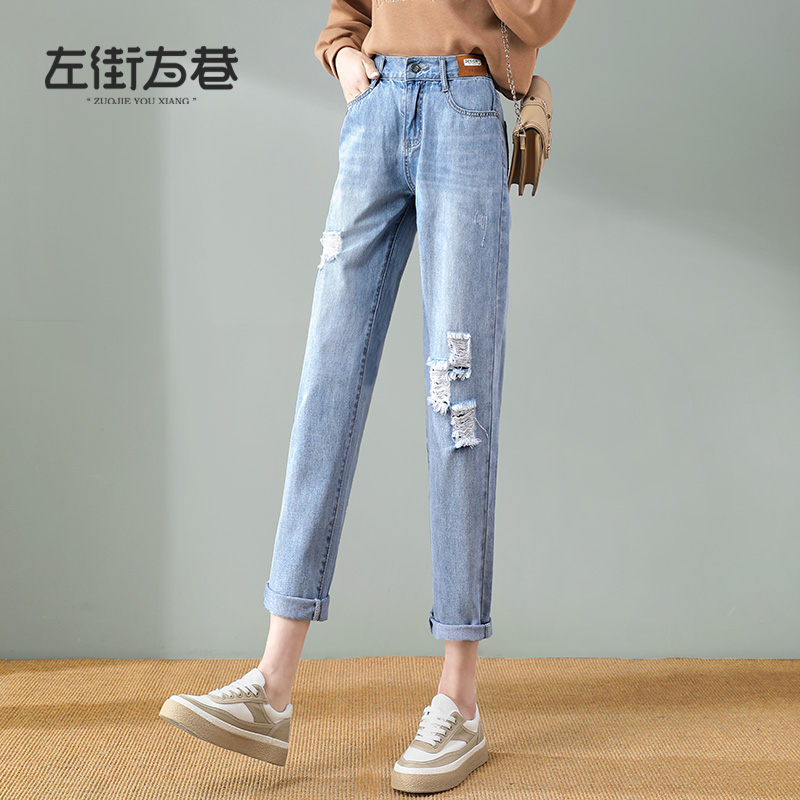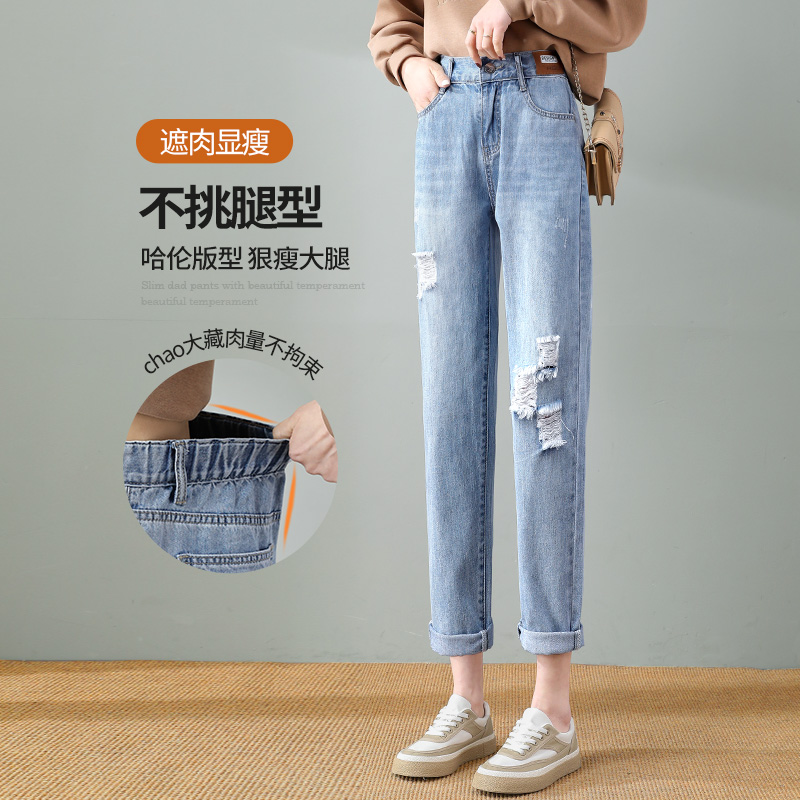 High waist ripped jeans women's trendy ins summer 2022 new straight loose nine-point harem daddy pants
