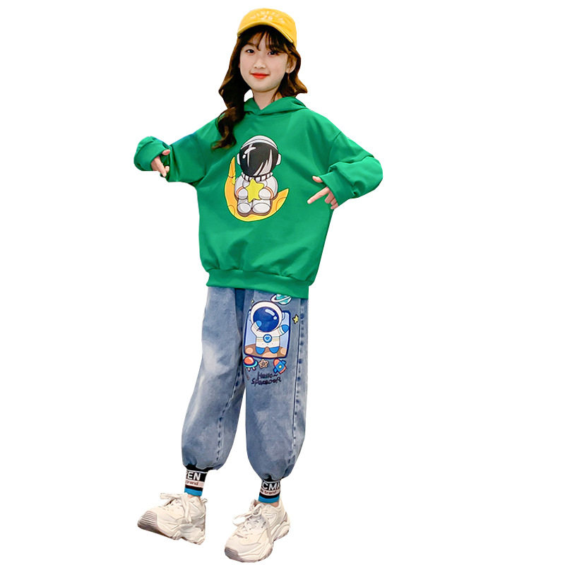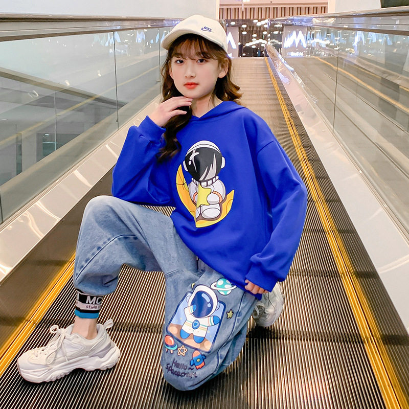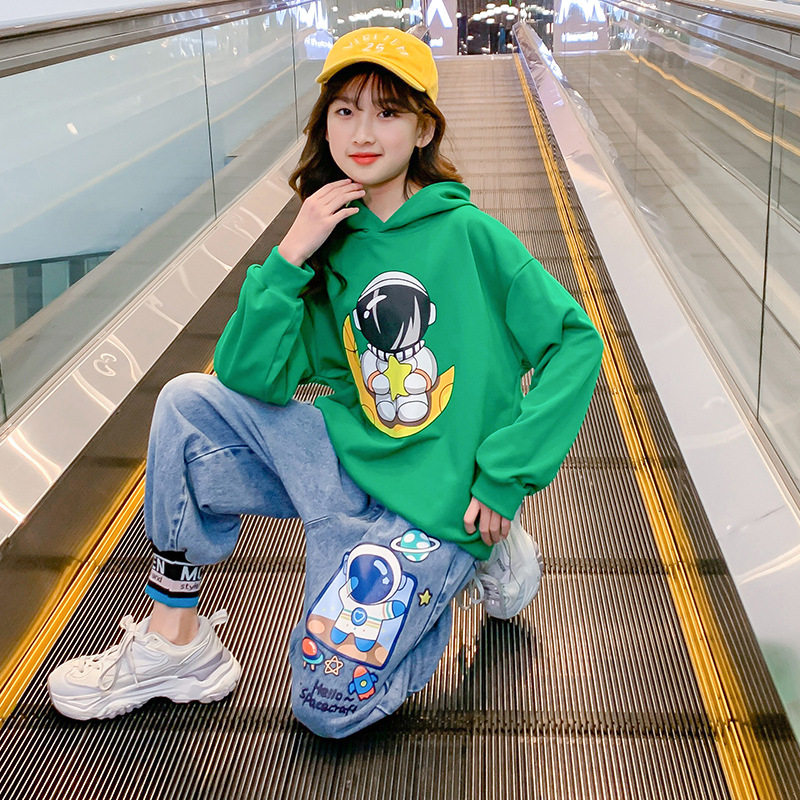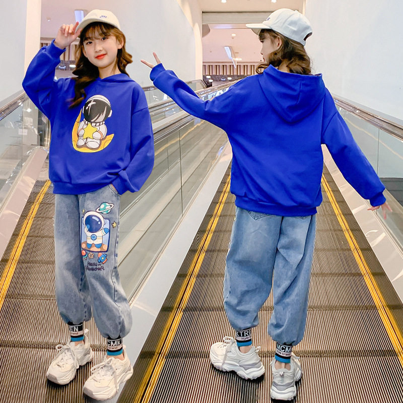 2022 Spring New Girls' Suits Spring Big Boys Korean Version Cartoon Print Hooded Sweater Jeans Two-piece Set