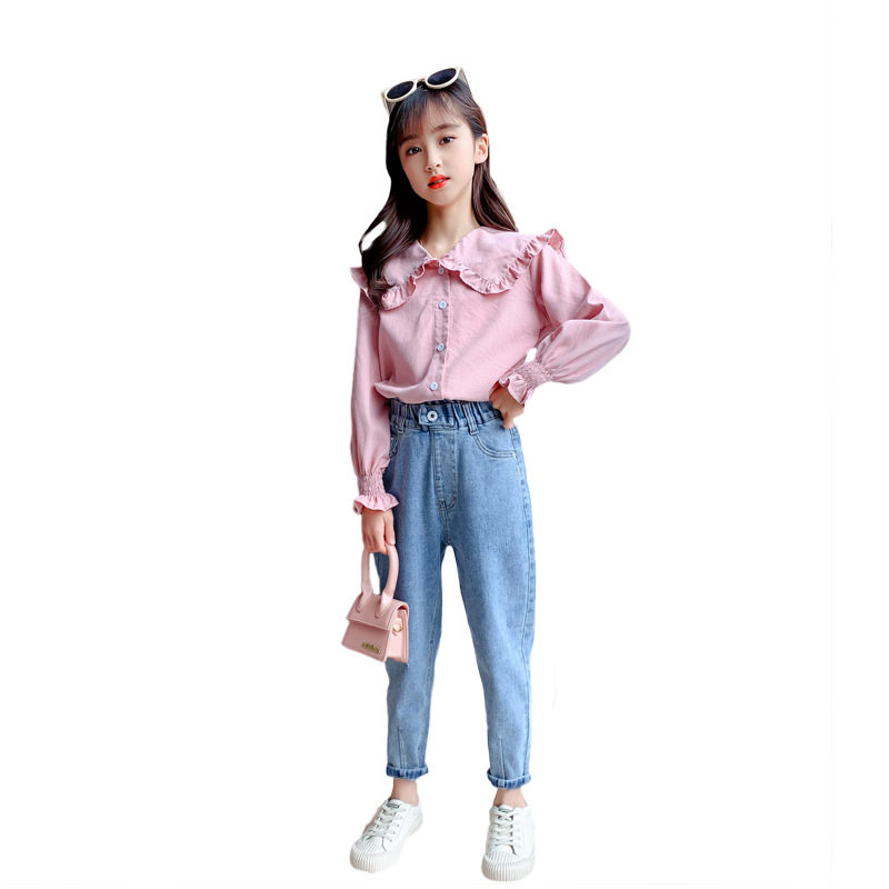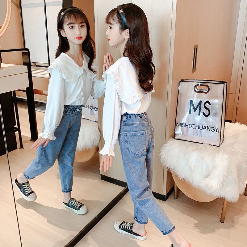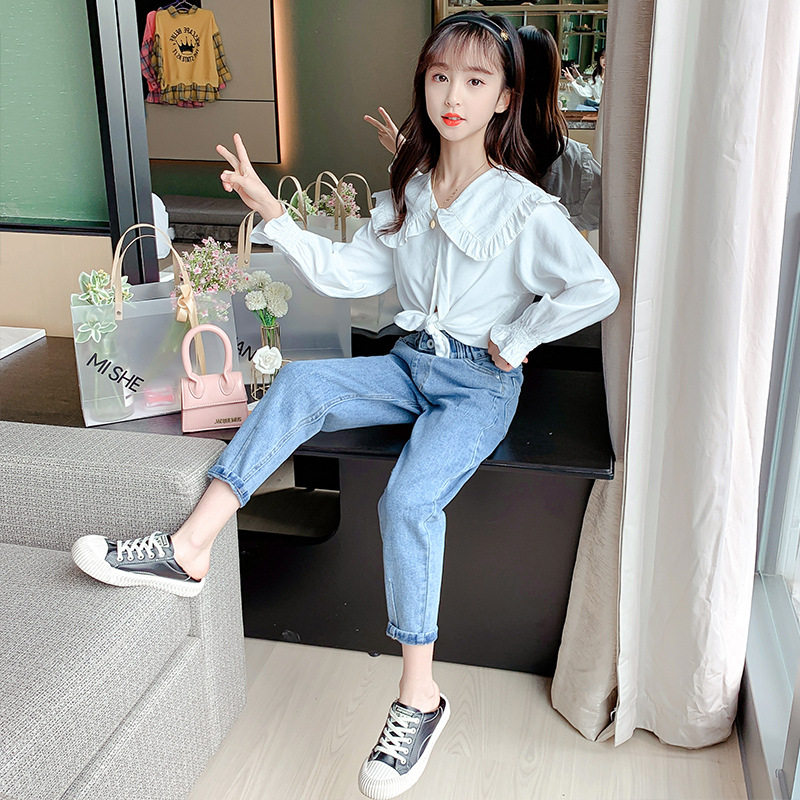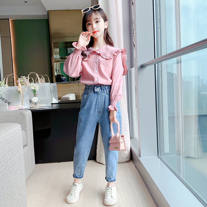 2021 Autumn New Girls' Suit Autumn Outfit Big Boy Korean Style Western Style Lace Shirt Denim Trousers Two-piece Set