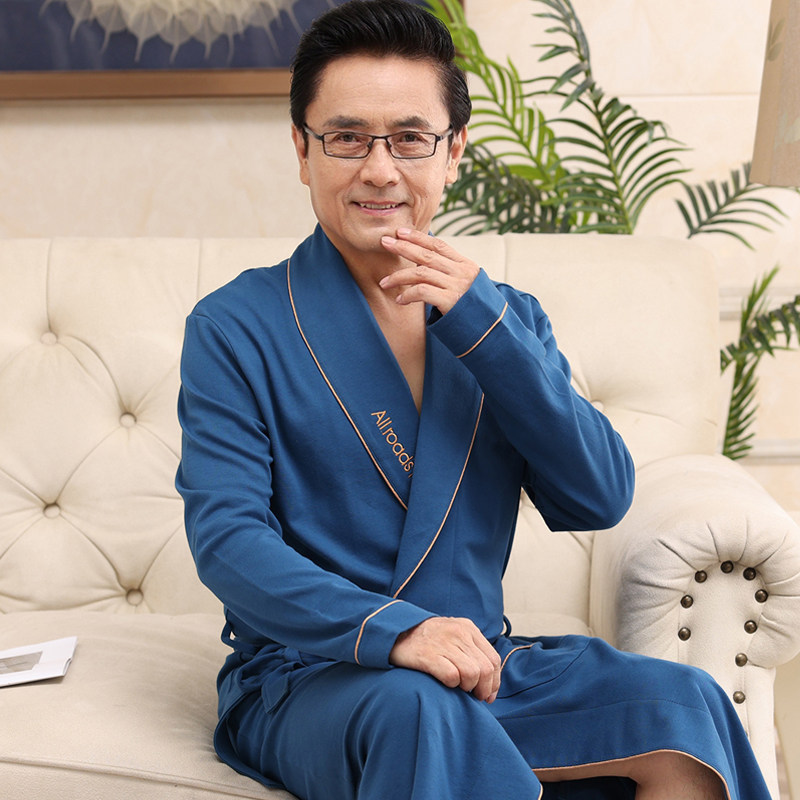 Men's Sleeping Robes Men's Pure Cotton Long Sleeve Spring Fall Father Dad's Thin plaid with long version of bathrobe bathrobe home clothes