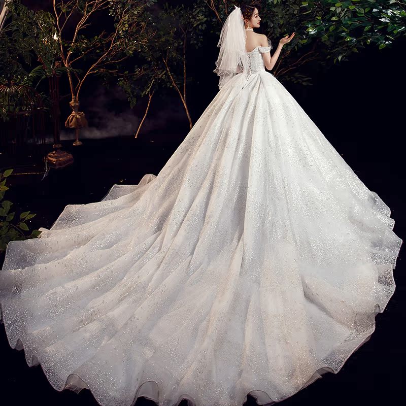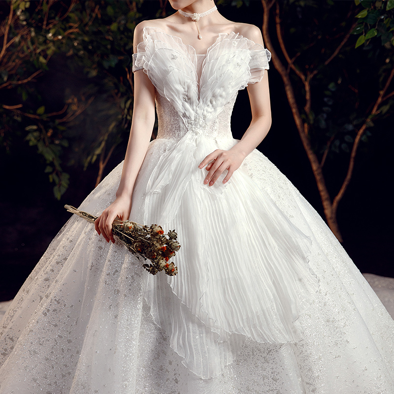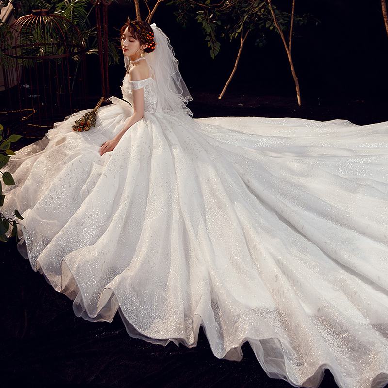 One word shoulder main wedding dress 2022 new summer bridal V-neck small starry sky light French big tail girl