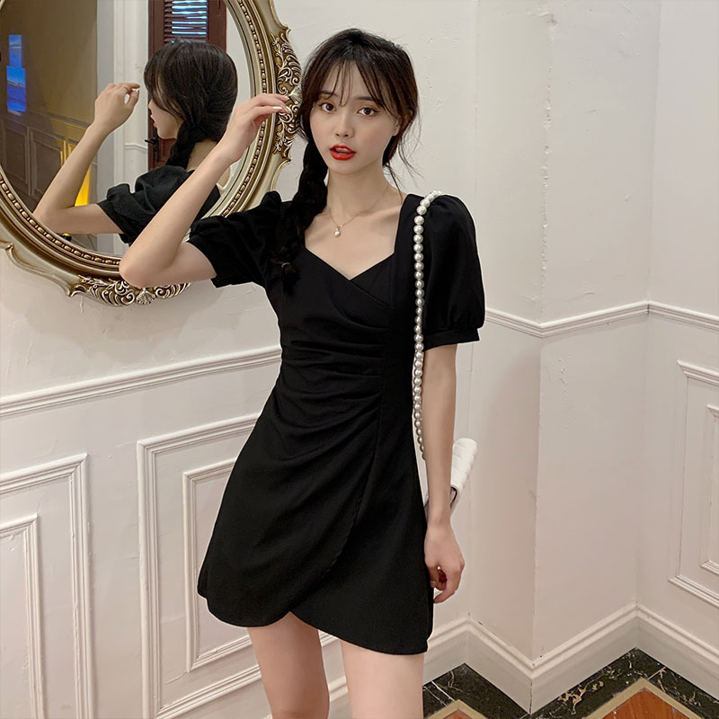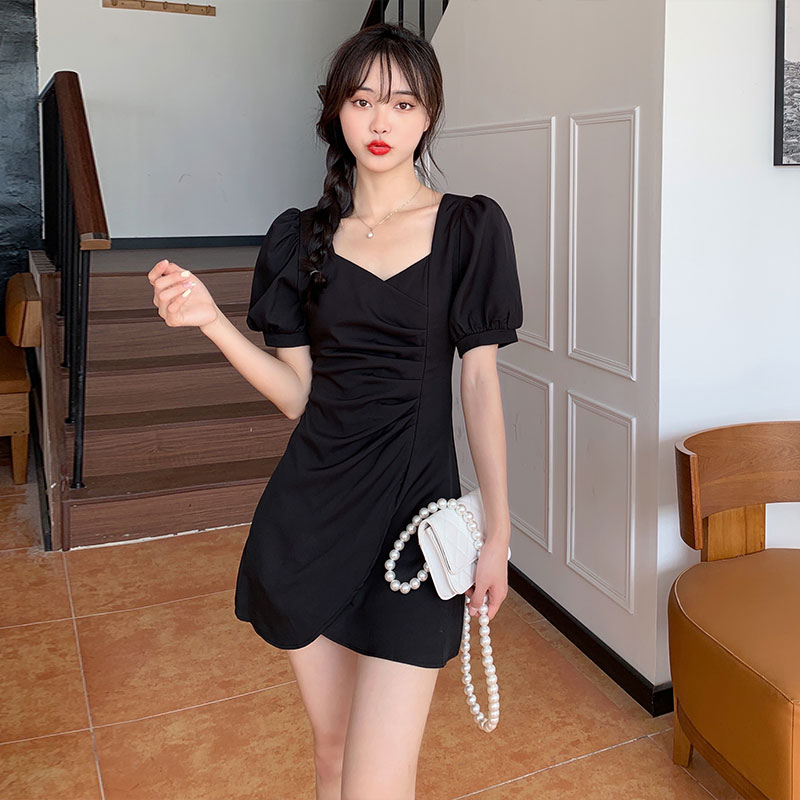 Large size dress French style Temperament Bubble cuff square collar collection waist irregular skirt Fat mm Belly Button Slim dress