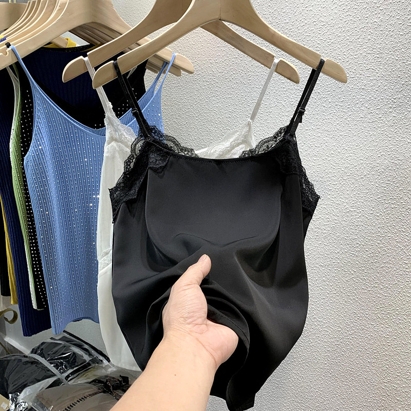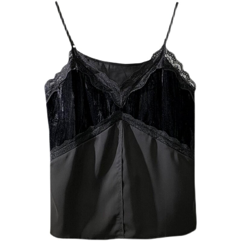Black velvet camisole women's summer outer wear V-neck sexy all-match lace stitching inner bottoming sleeveless top