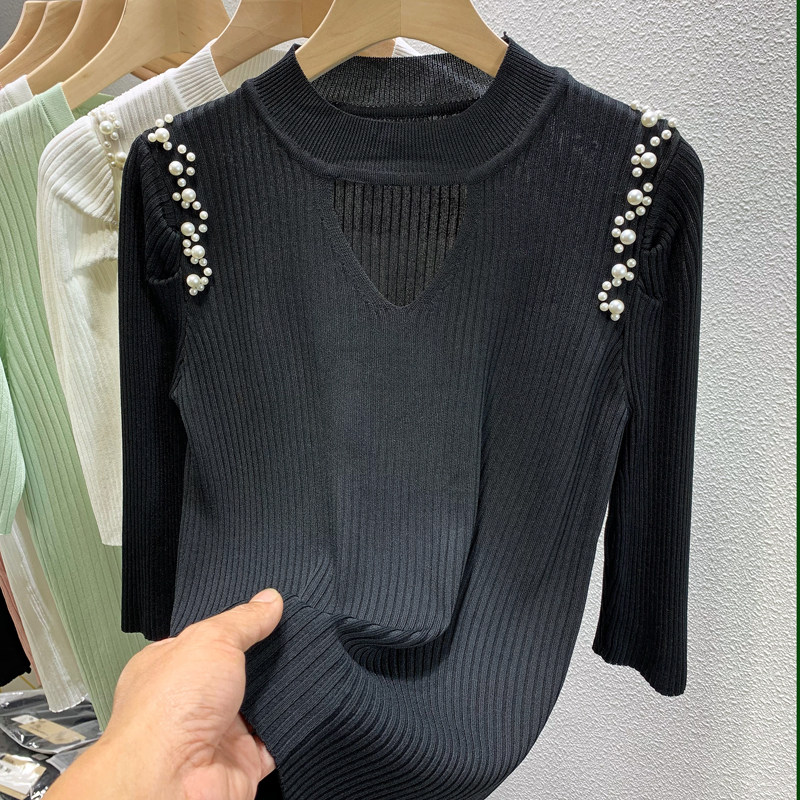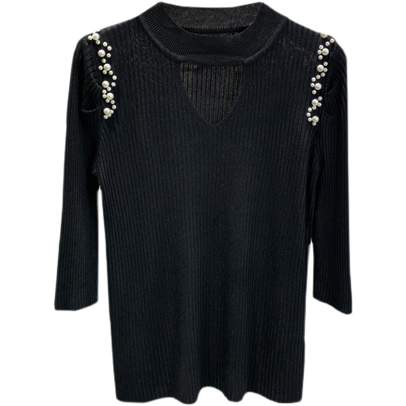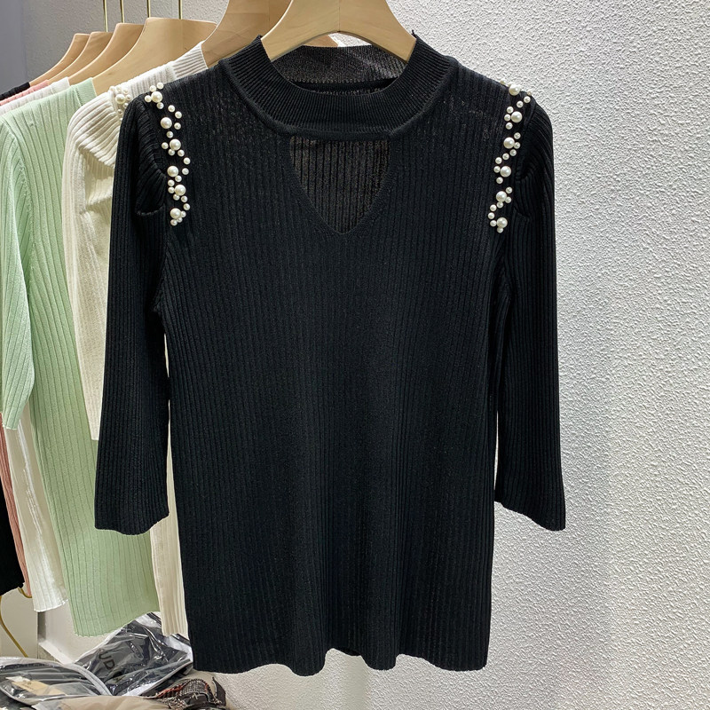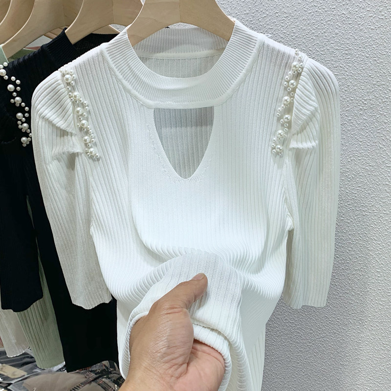 2022 summer new five-point sleeve bottoming T-shirt women's puff sleeves beaded hollow design sense careful machine knitted top