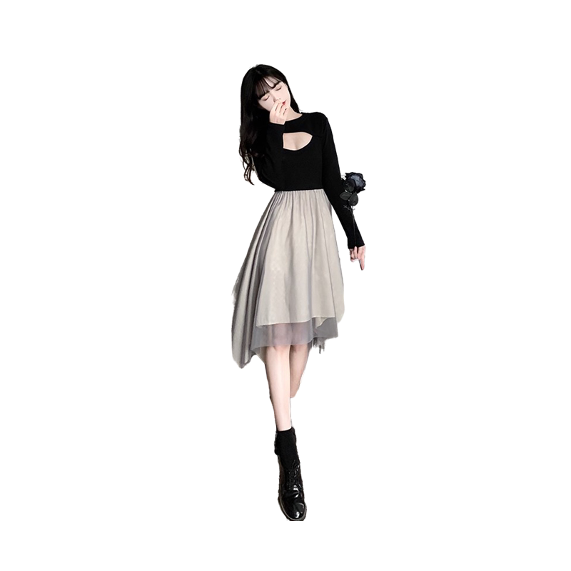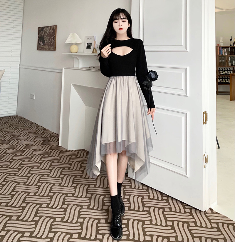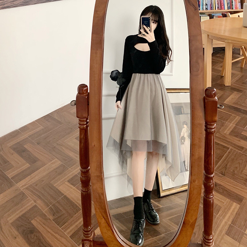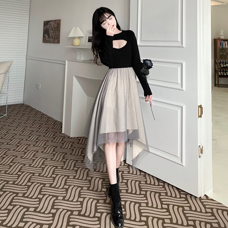 2022 slim casual maternity dress black dress mesh stitching slim temperament super fairy irregular skirt