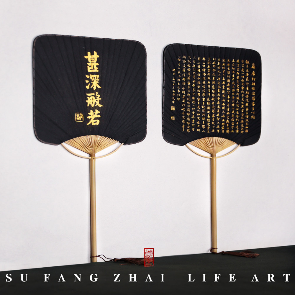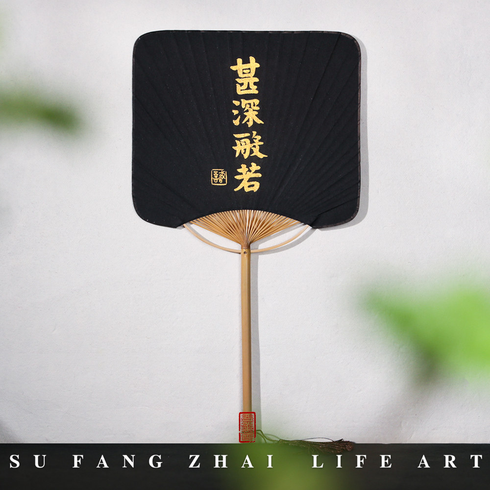 Heart warp paper group fan ancient wind small block letters fan long handle thickened black Xuan paper square Japanese style Zen group fan